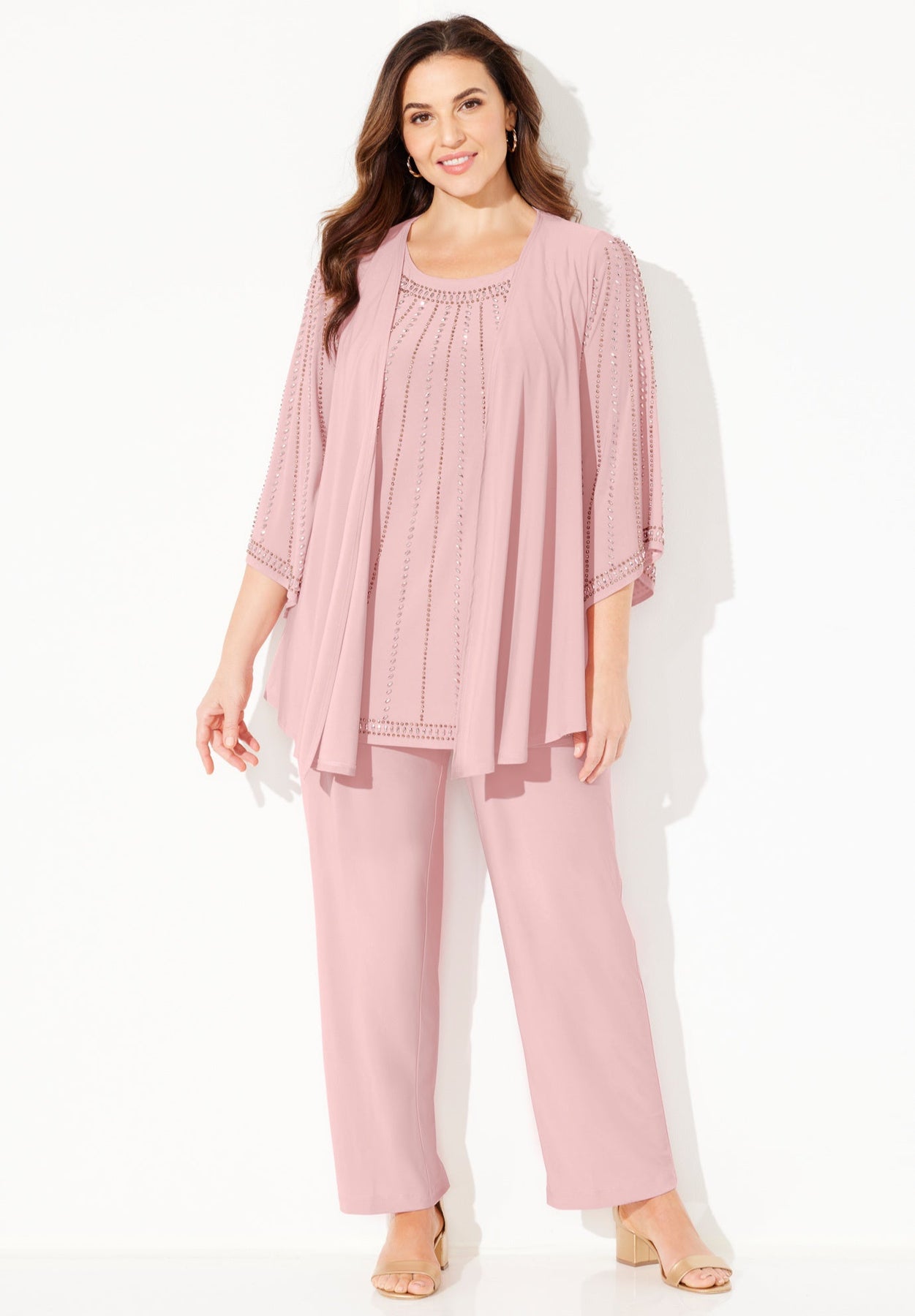 This elegant 3-piece ensemble is beautifully beaded to add a splash of chic sparkle. Tank, jacket, and pants make up this effortlessly stunning trio, so well-suited to make you feel special for any occasion.  Slip on a pair of strappy sandals and you’re good to go.