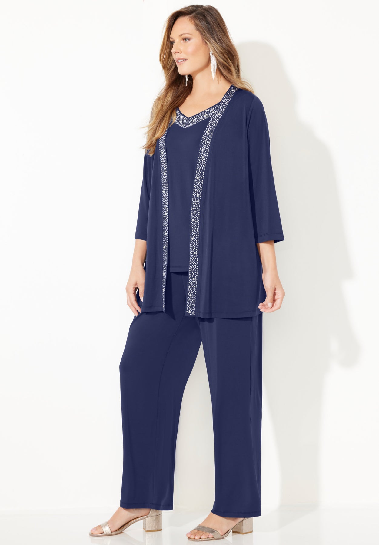 Our cardigan pant suit – matching tank, cardigan and pants - has a flair for showing off its fancy side. Note how the beaded trim on the cardigan’s placket gives its style sparkling personality. It’s fair to say, it turns this pantsuit into a bedazzling beauty.