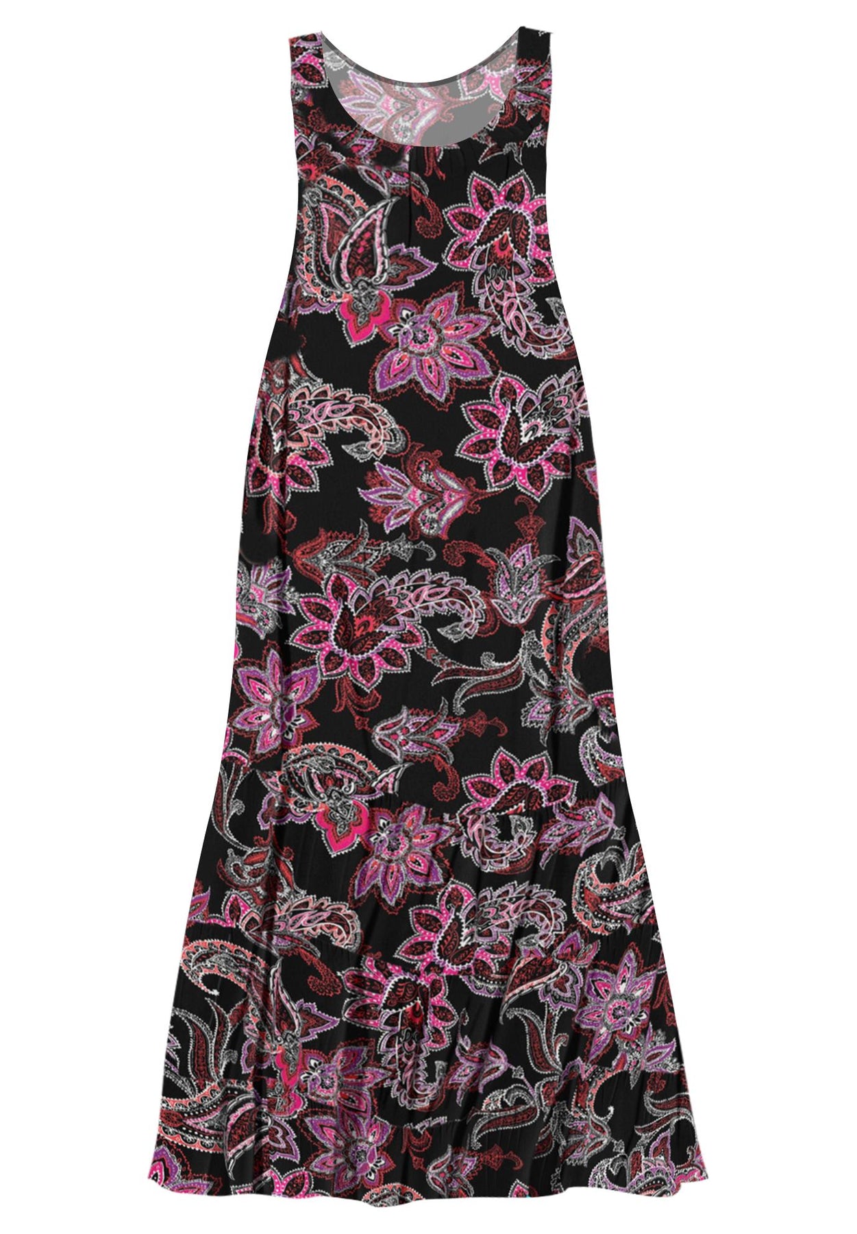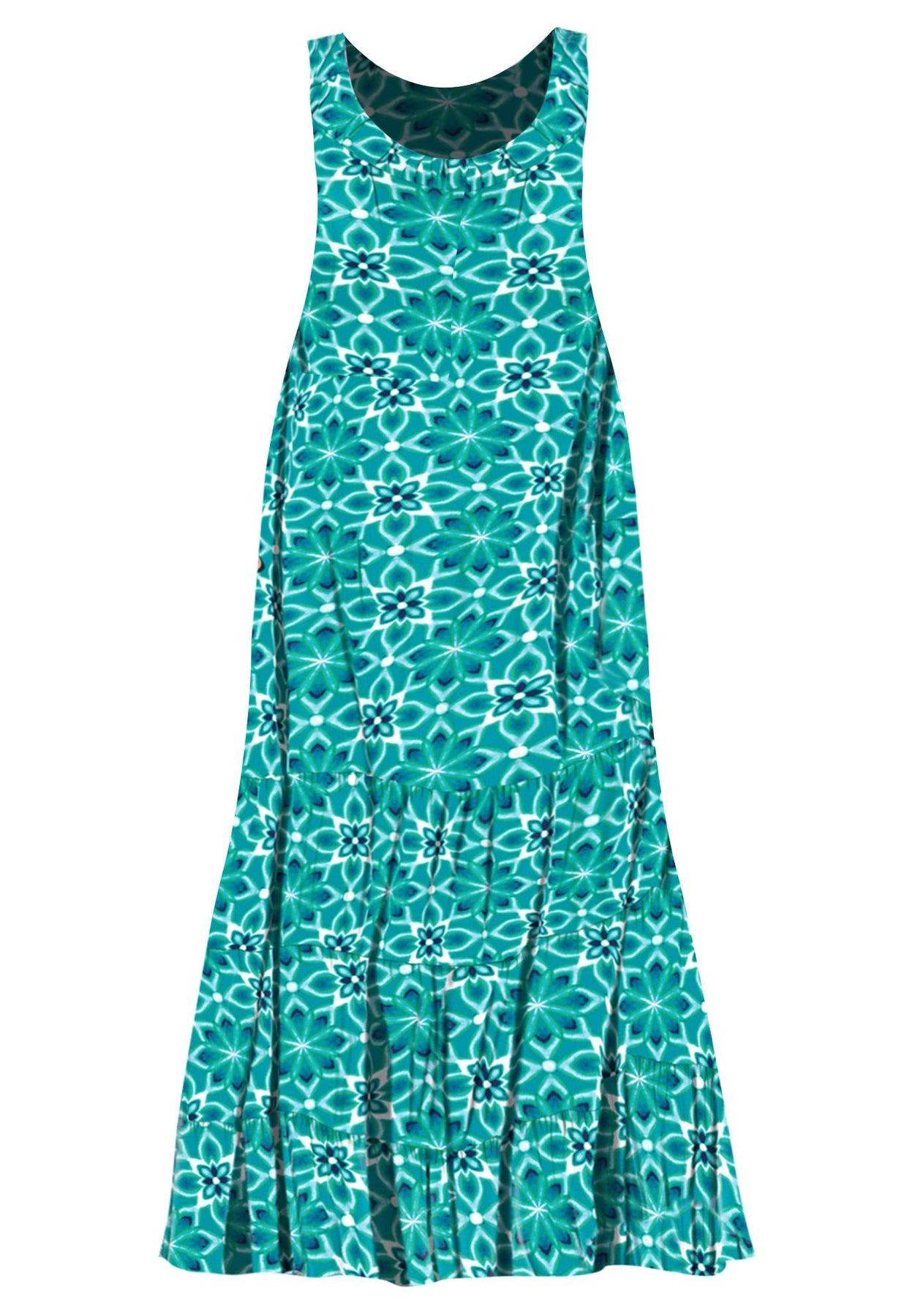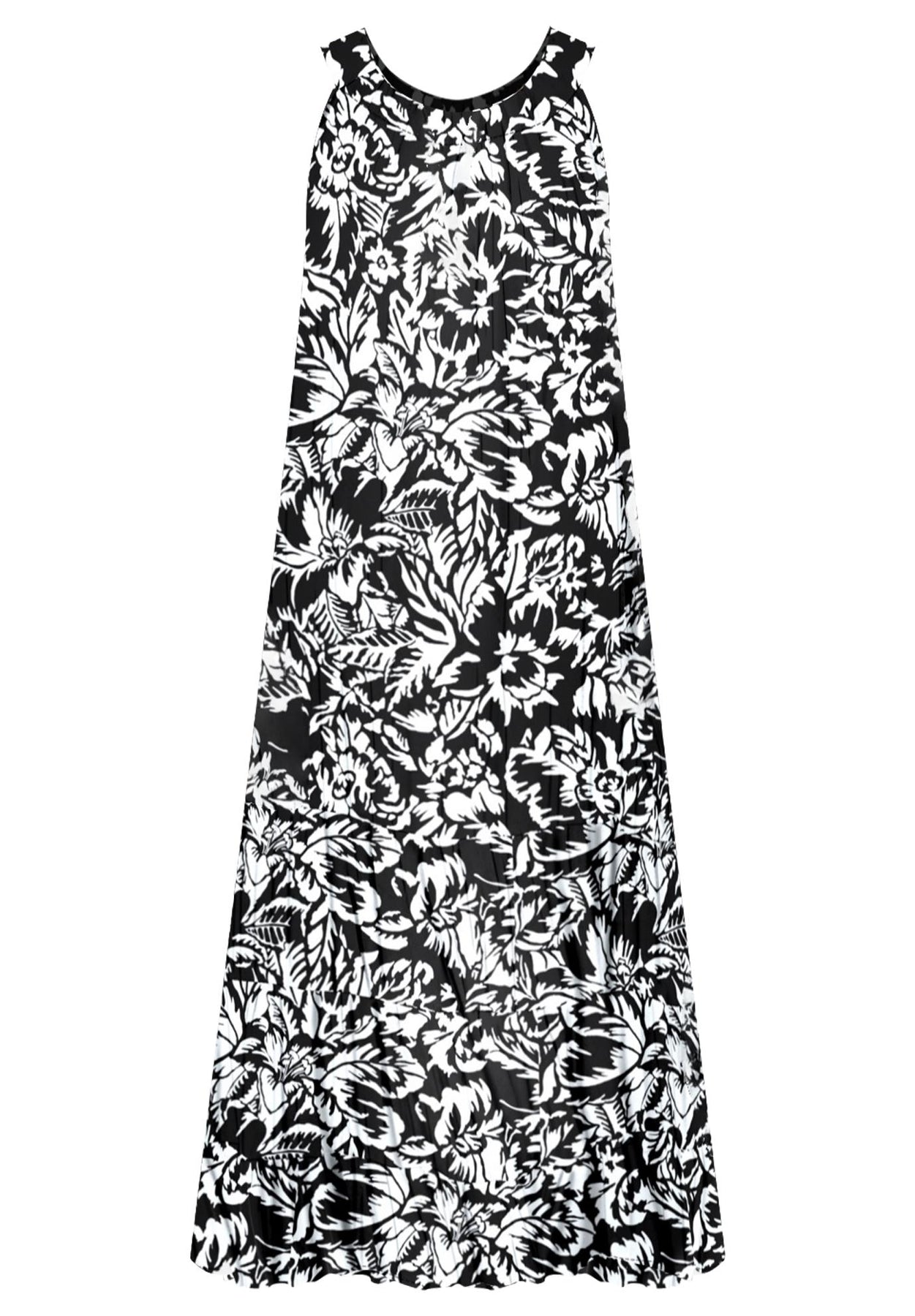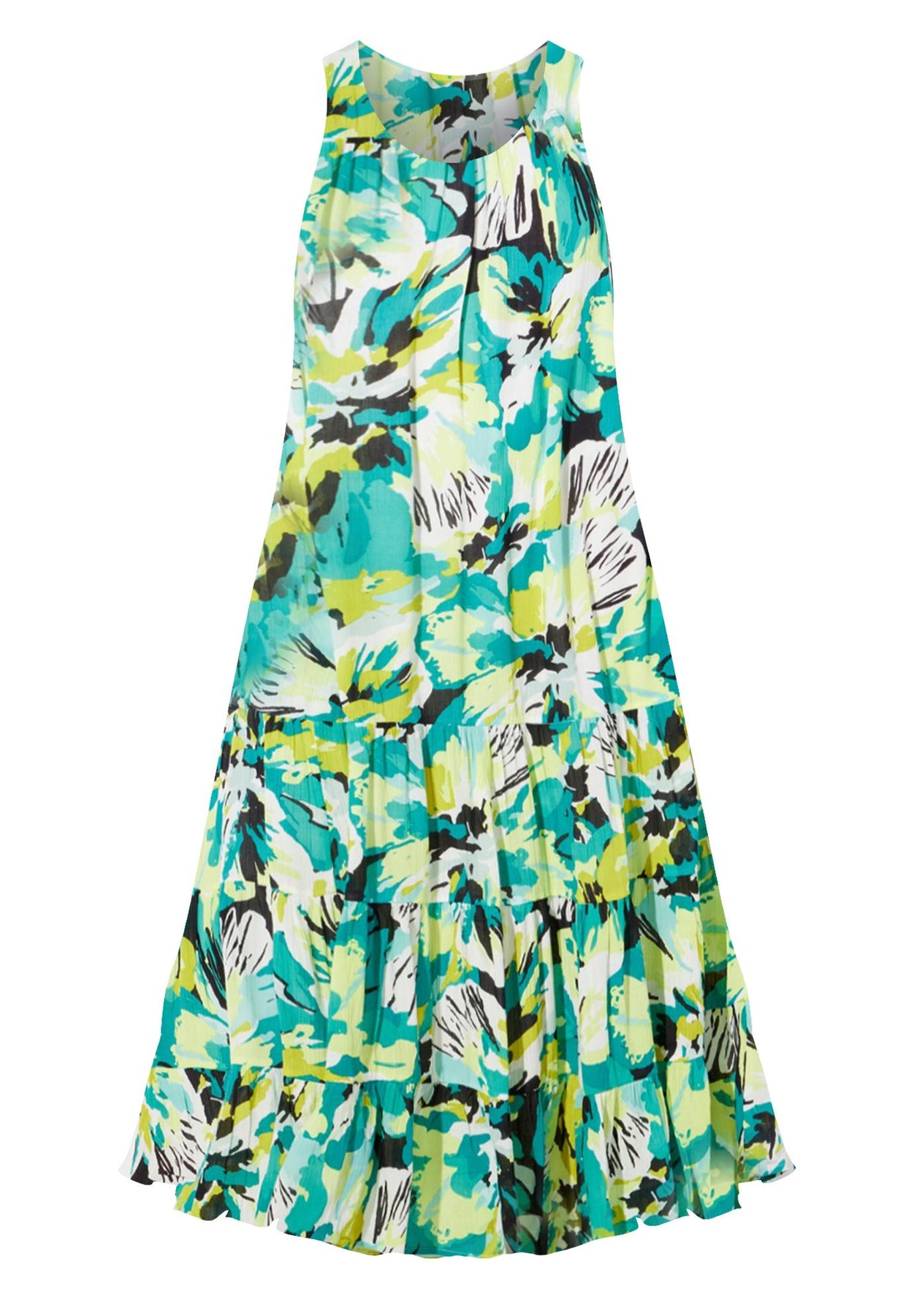 FIT: Floats aways from the body without clinging. Tiered bottom bands. Maxi length. Halter neckline. Side seam pockets.
