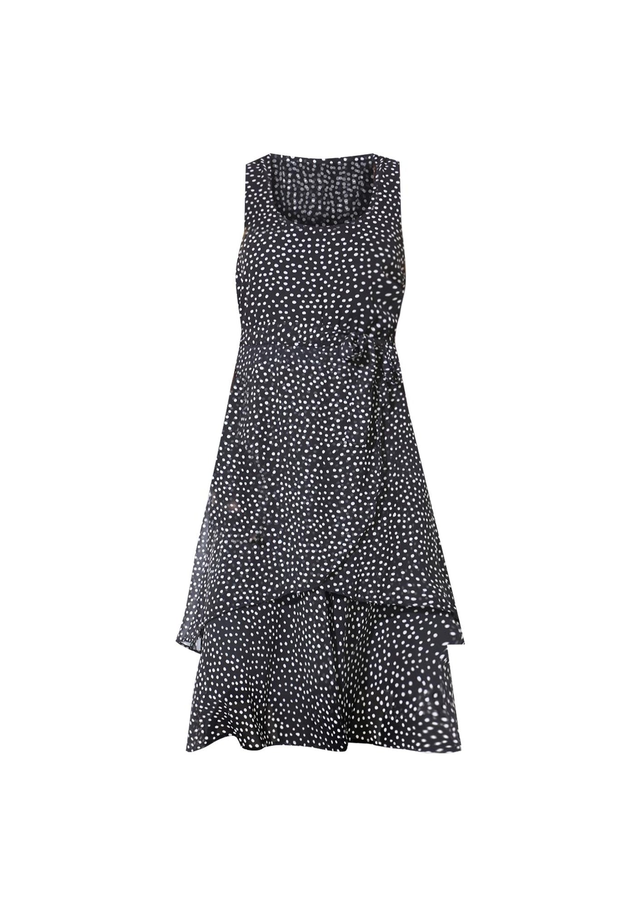 Our sleeveless, V-neck dress gets a beautiful dose of fashion oomph from its dramatic flyaway skirt. Then add to that a slimming empire waist and shirring for added shaping and away we go.