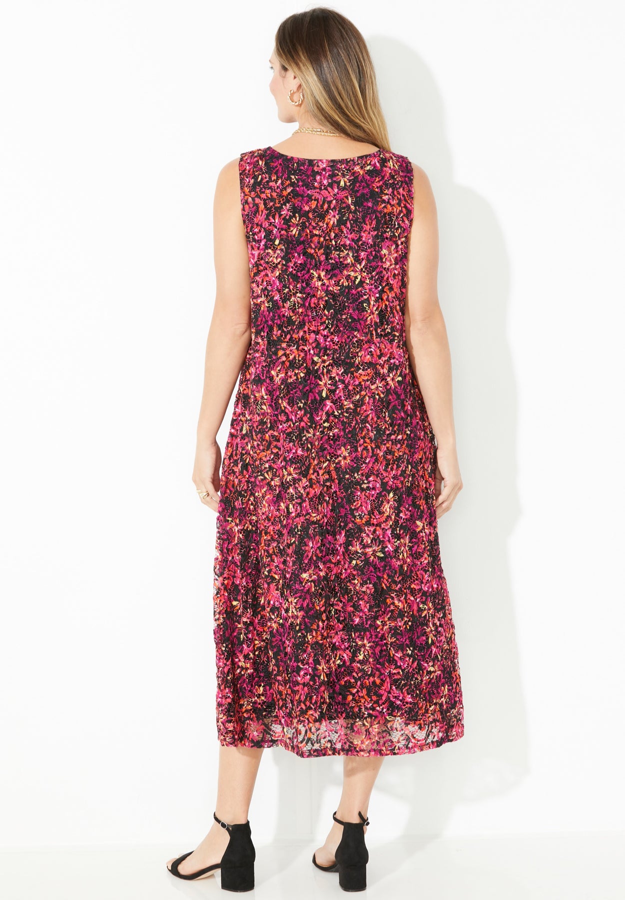 Talk about effortless style! Our sleeveless A-line dress is exquisitely crafted with allover stretch lace making it a show-stopping style for any dressy occasion. This flattering silhouette flatters every figure. Wear alone with strappy sandals or top it off with one of our breezy cardigans to complete your look.