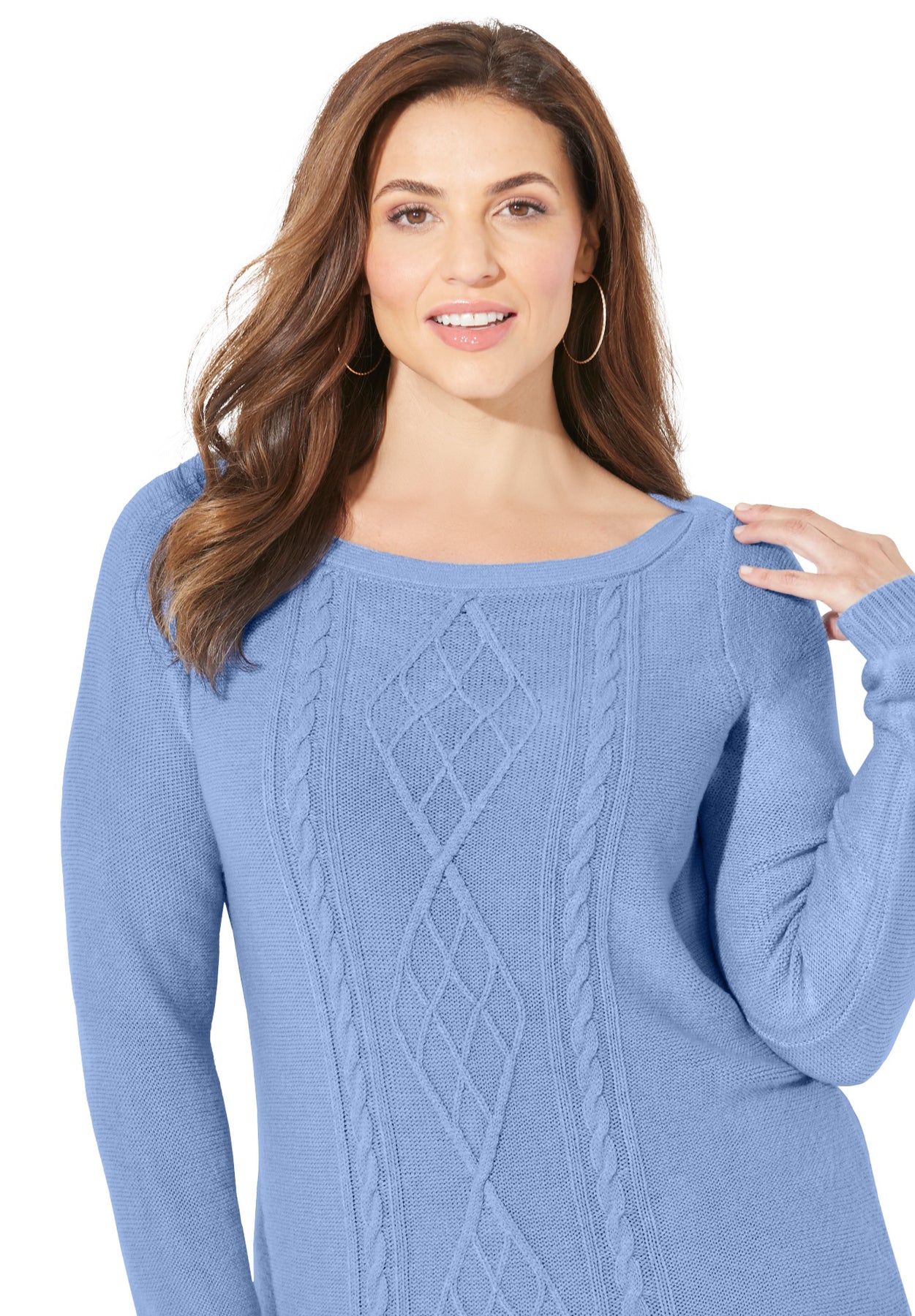 Soft with the luxurious feel of cashmere. Is there any better reason to cozy up to this cable knit sweater? Not to mention, an easy fit that complements your shape beautifully.