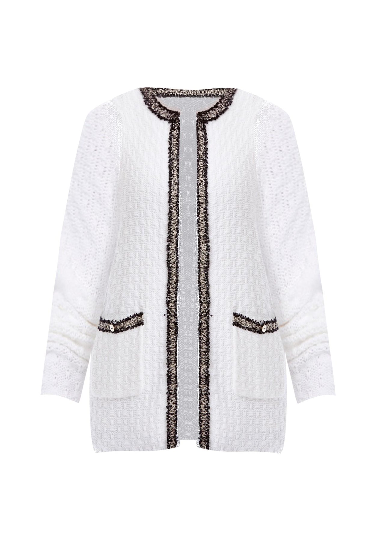 Our Iconic Cardigan Blazer loves to make a fashion statement. This collarless, long sleeved beauty has patch pockets, an open front with hidden hook-and-eye closure and contrast stitch detail that gives any outfit instant style.