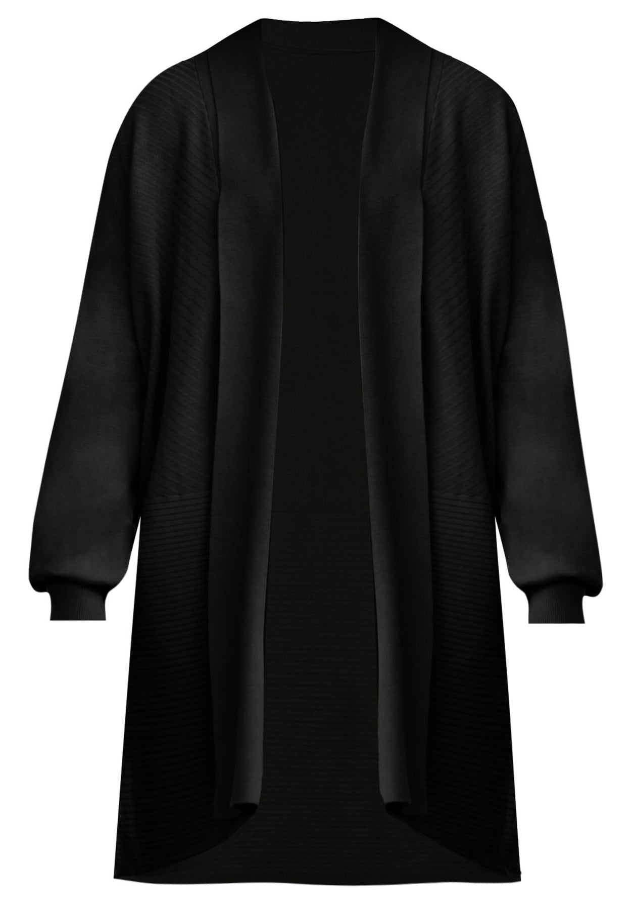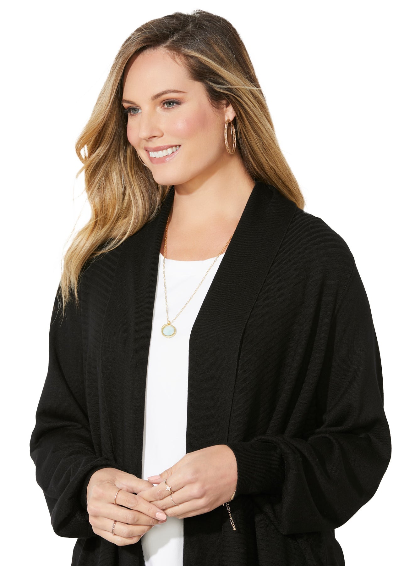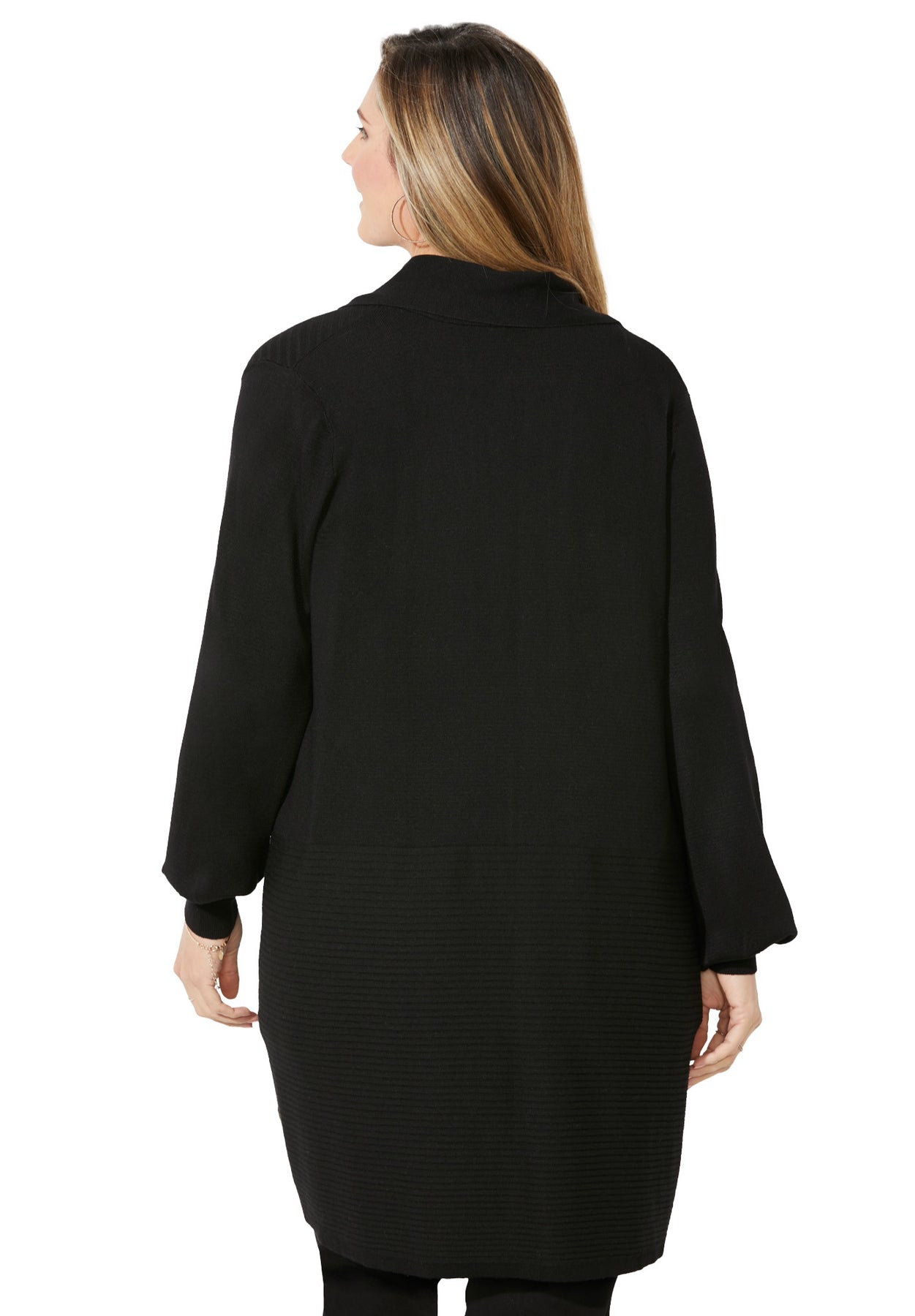 FIT: Relaxed and easy with open front and foldover draped panel. Fully fashioned long sleeves with rib trim.