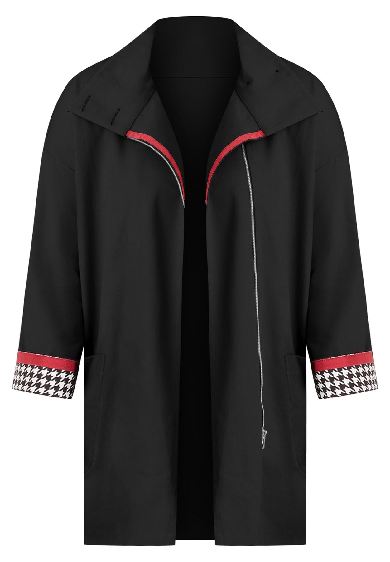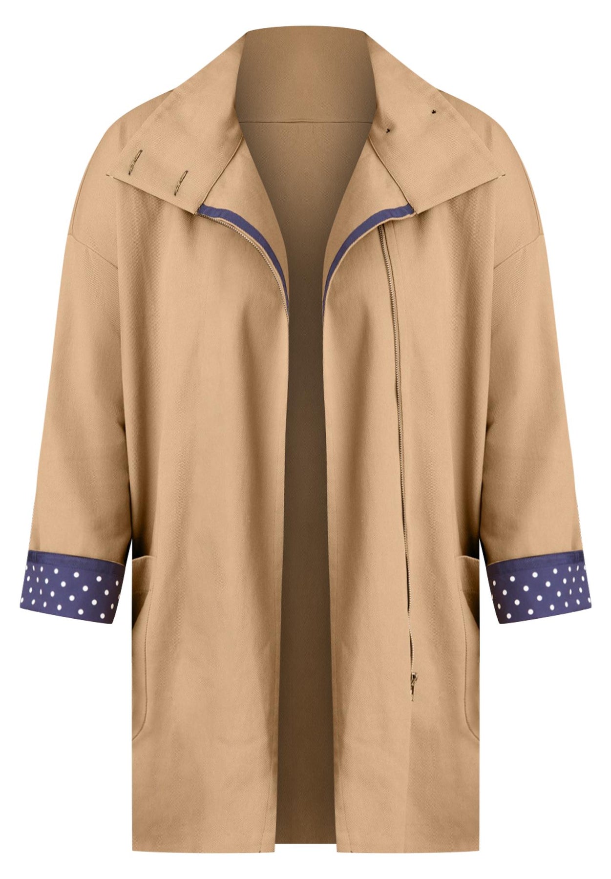Fashion meets function in this soft, cotton twill raincoat with asymmetrical zipper and plaid lining at the neckline and sleeves.
