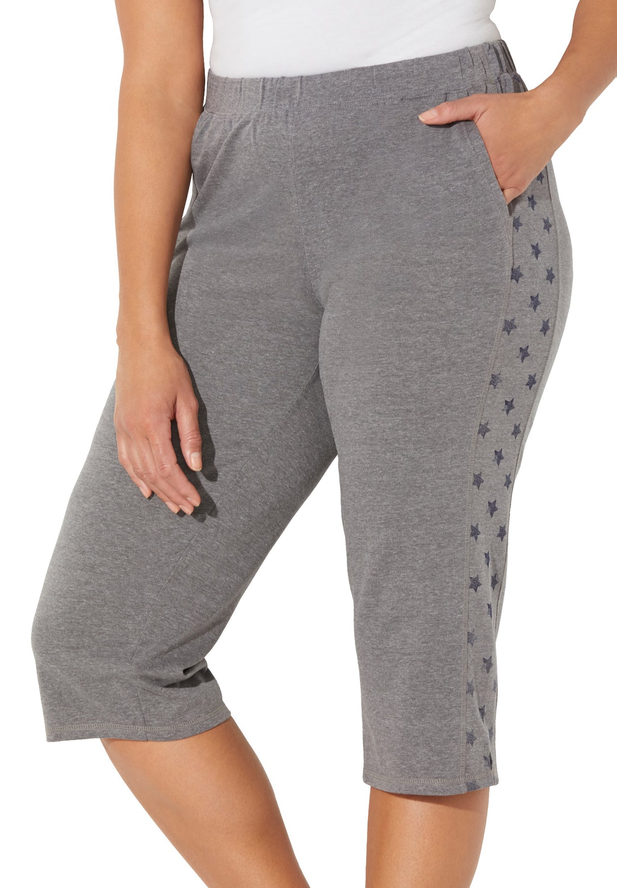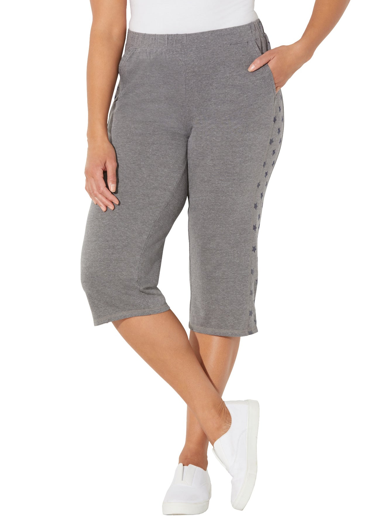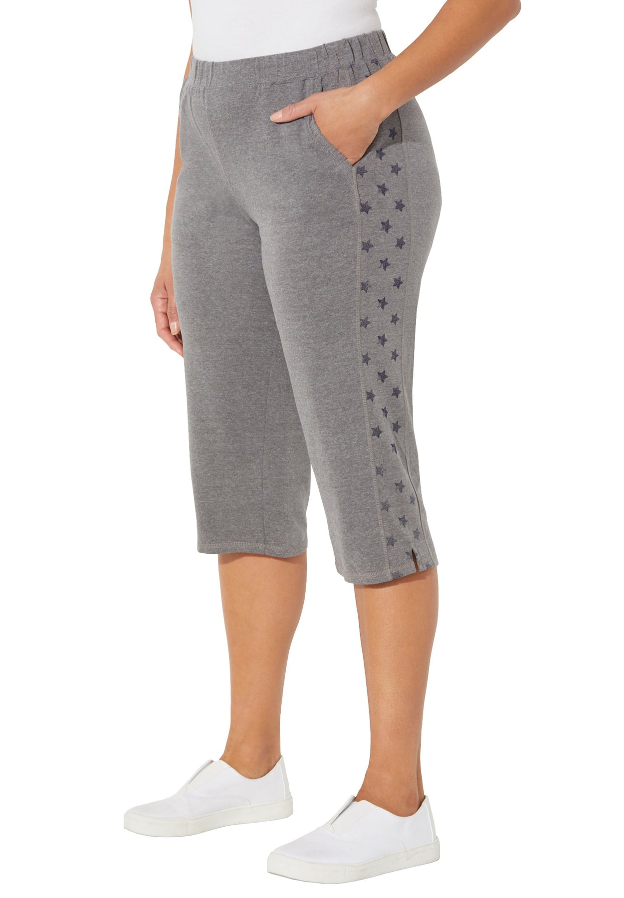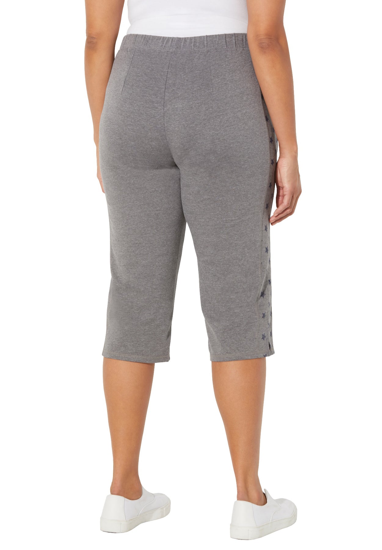 So soft and comfortable, this easy pull-on capri will quickly become an everyday essential in your wardrobe. Side panel has contrast print for a slimming colorblock effect. Made to match our French Terry Short Sleeve Hoodie Pullover.