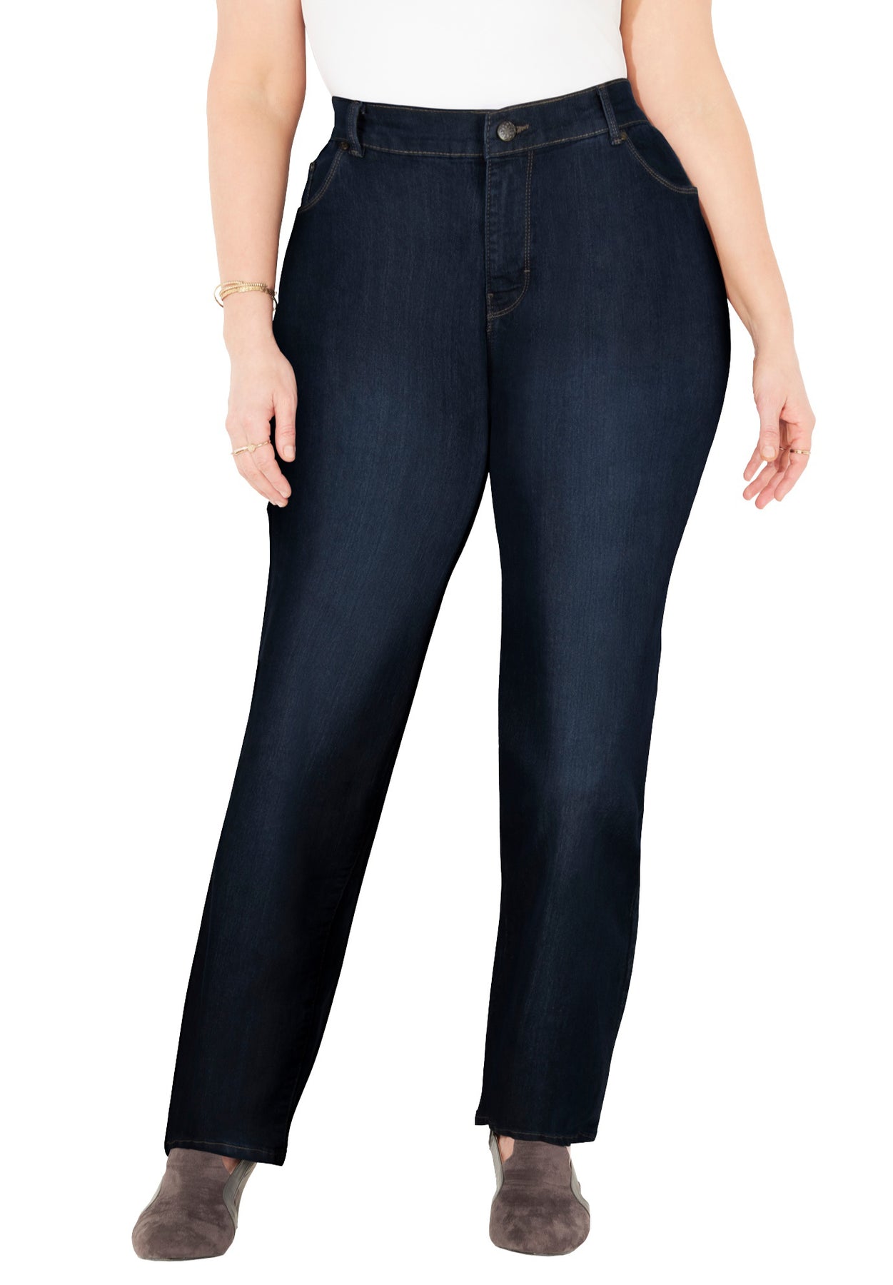 FIT: A slimming style for those who are fullest at the hips. Relaxed fit that smooths comfortably from waist to hip. Zip fly with button closure. Elastic stretch on sides of waist. Classic 5-pockets. Straight leg.