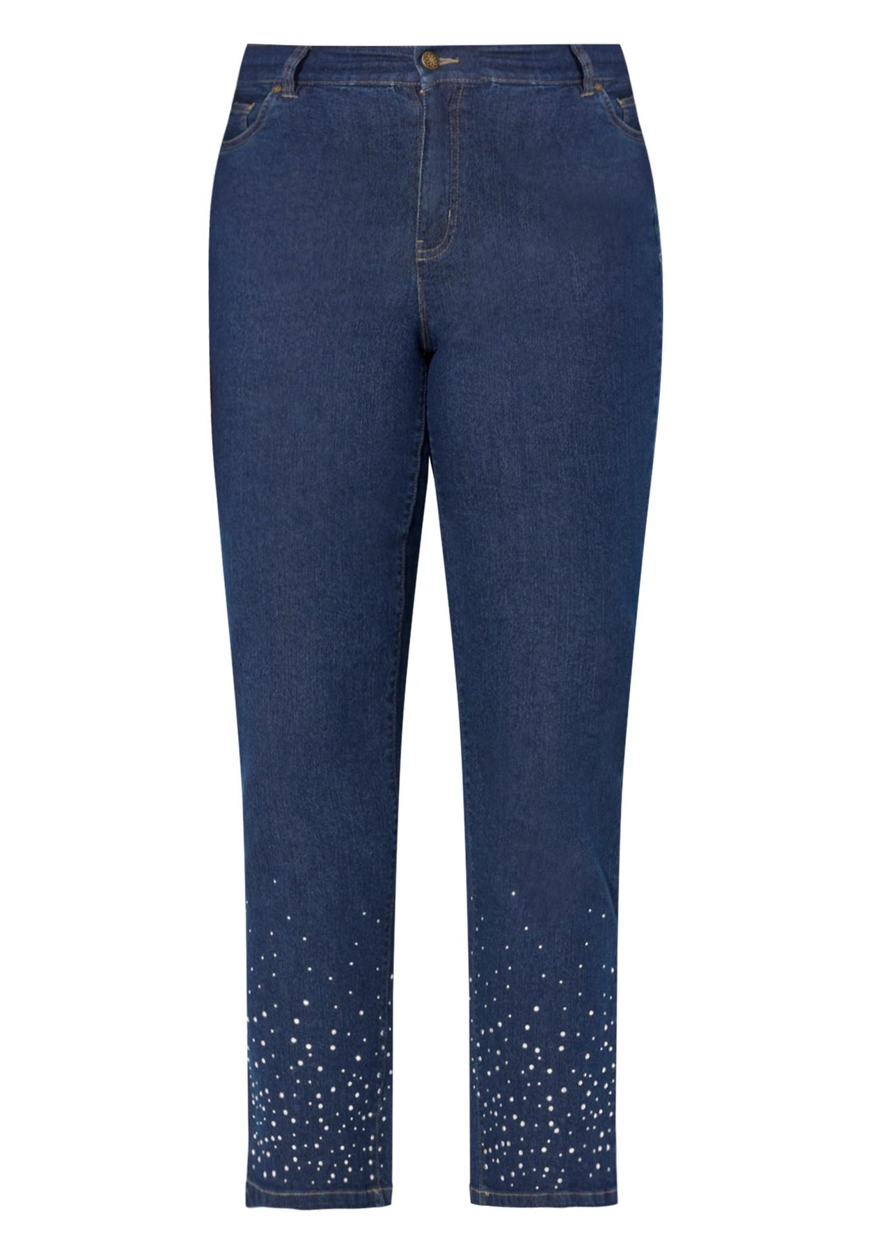 FIT: A slimming style for those who are slightly curvy at the hips. Relaxed fit that smooths comfortably from waist to hip. Zip fly with button closure. Elastic stretch on sides of waist. Classic 5-pockets. Straight leg. Rhinestone embellishment from knee to ankle.