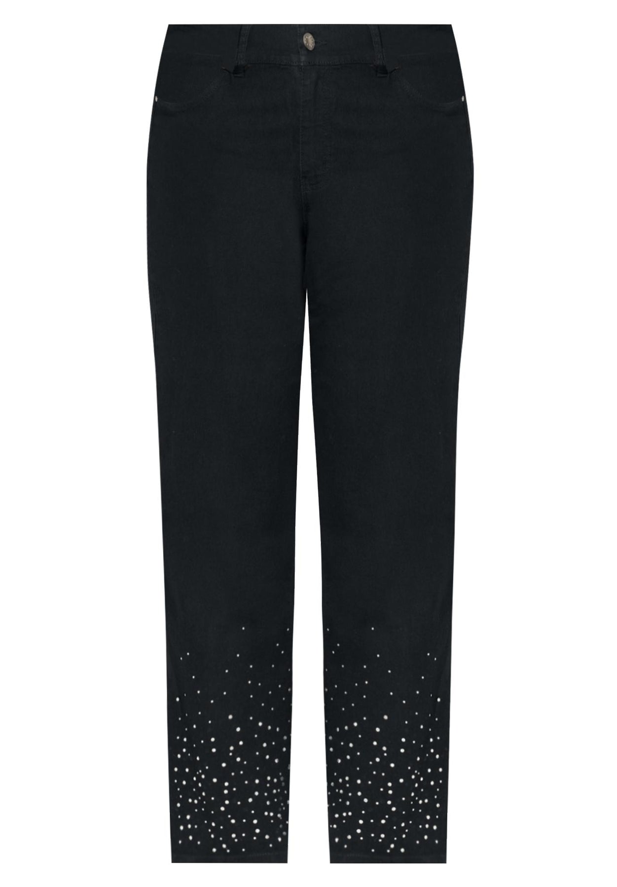 FIT:  A slimming style for those who are slightly curvy at the hips. Relaxed fit that smooths comfortably from waist to hip. Zip fly with button closure. Elastic stretch on sides of waist. Classic 5-pockets. Straight leg. Rhinestone embellishment from knee to ankle.