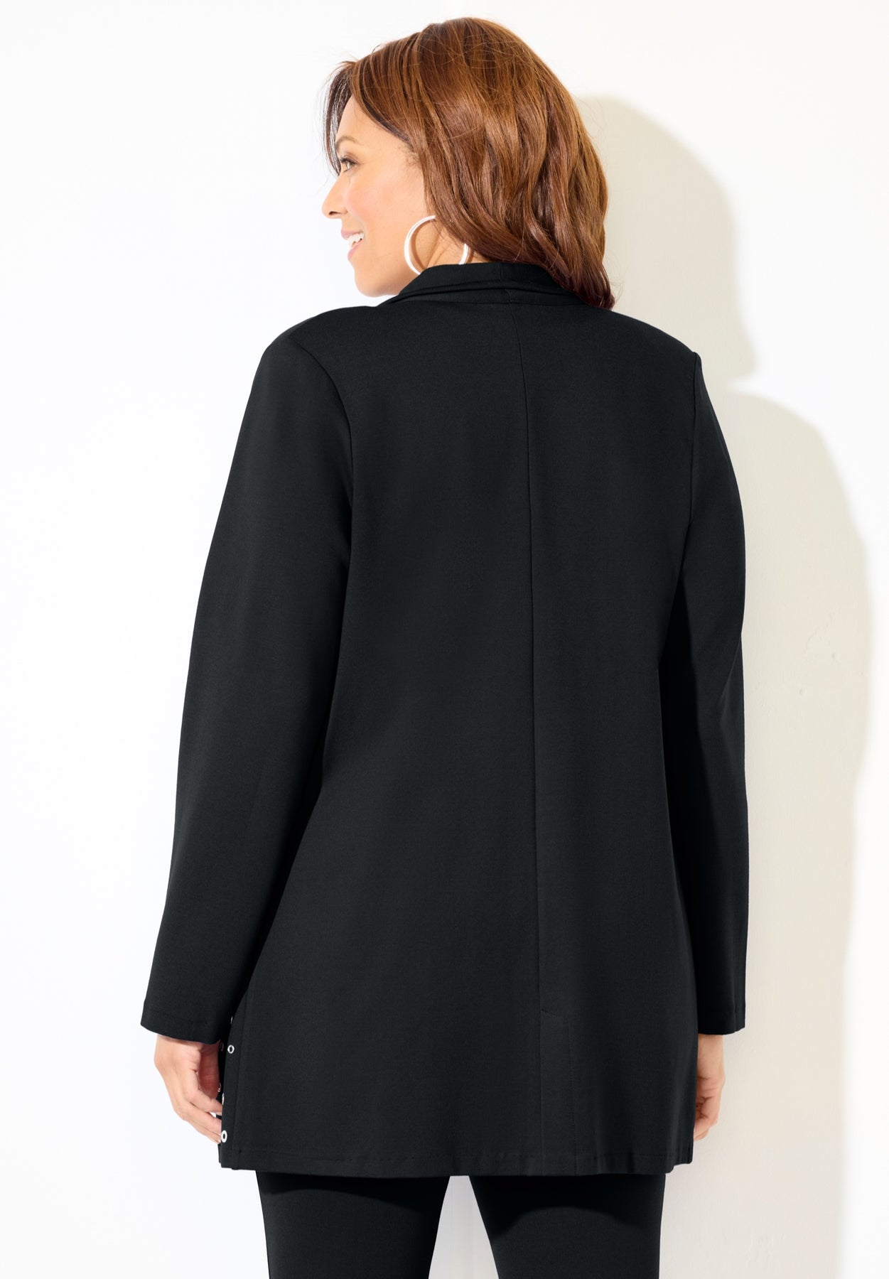 Part of our Black Label exclusive collection of premium, limited edition styles with a focus on fashion and quality. Once you try this jacket on you’ll notice how it elongates the body and flatters it with a slimming effect. You’ll feel how soft and smooth the Ponte fabric is and notice how much support it gives to the jacket’s shape. If you’re like us, you’ll appreciate how it drapes the body beautifully without clinging. It’s styled with leather-like binding along the edges and shiny silver grommets at the hem. It really is simply stunning.