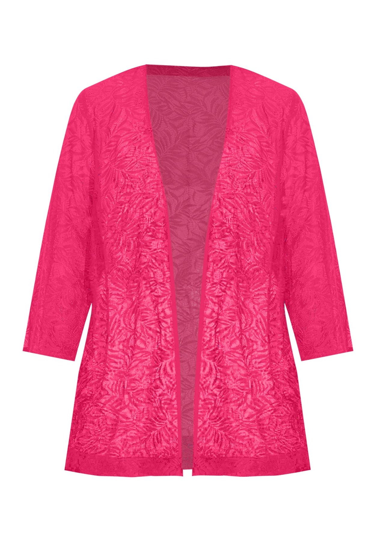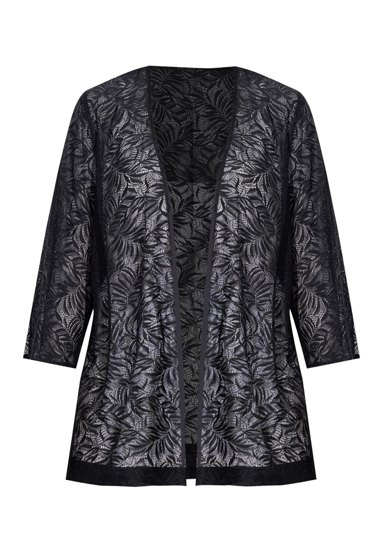 FIT:  Easy wearing, relaxed silhouette. Embroidered lace. Designed with an open front, three-quarter length sleeves, and 4” side slits on sleeves and hem.