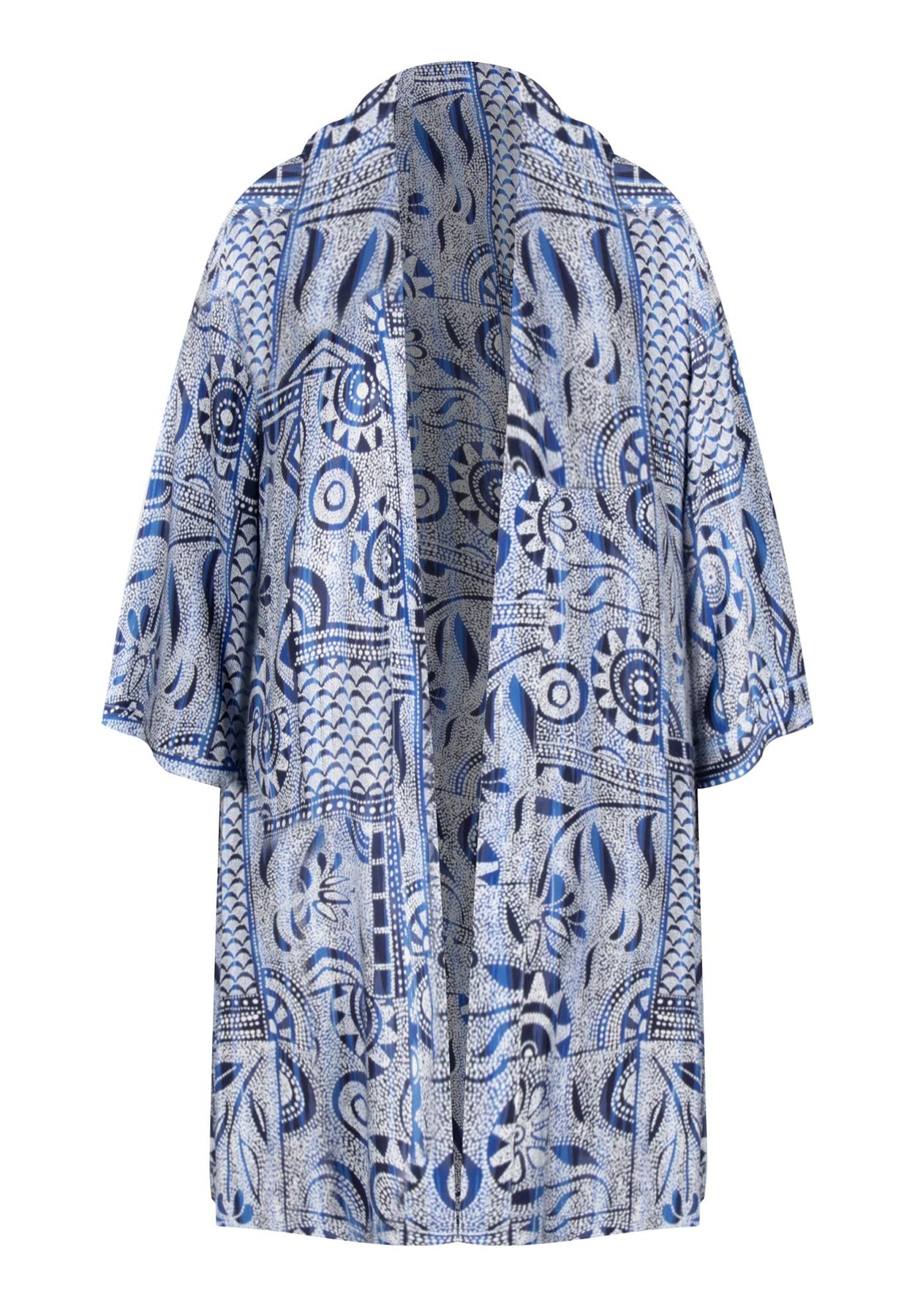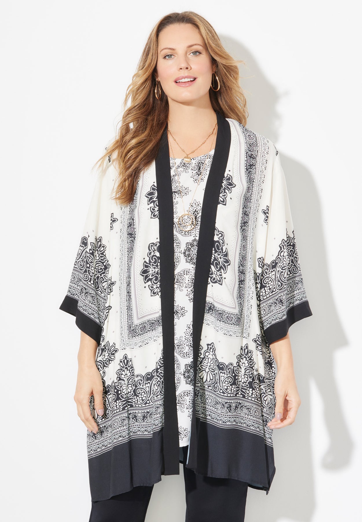 FIT: Relaxed and forgiving. Slight V-neckline with open front. Wide kimono sleeves. Long duster length.