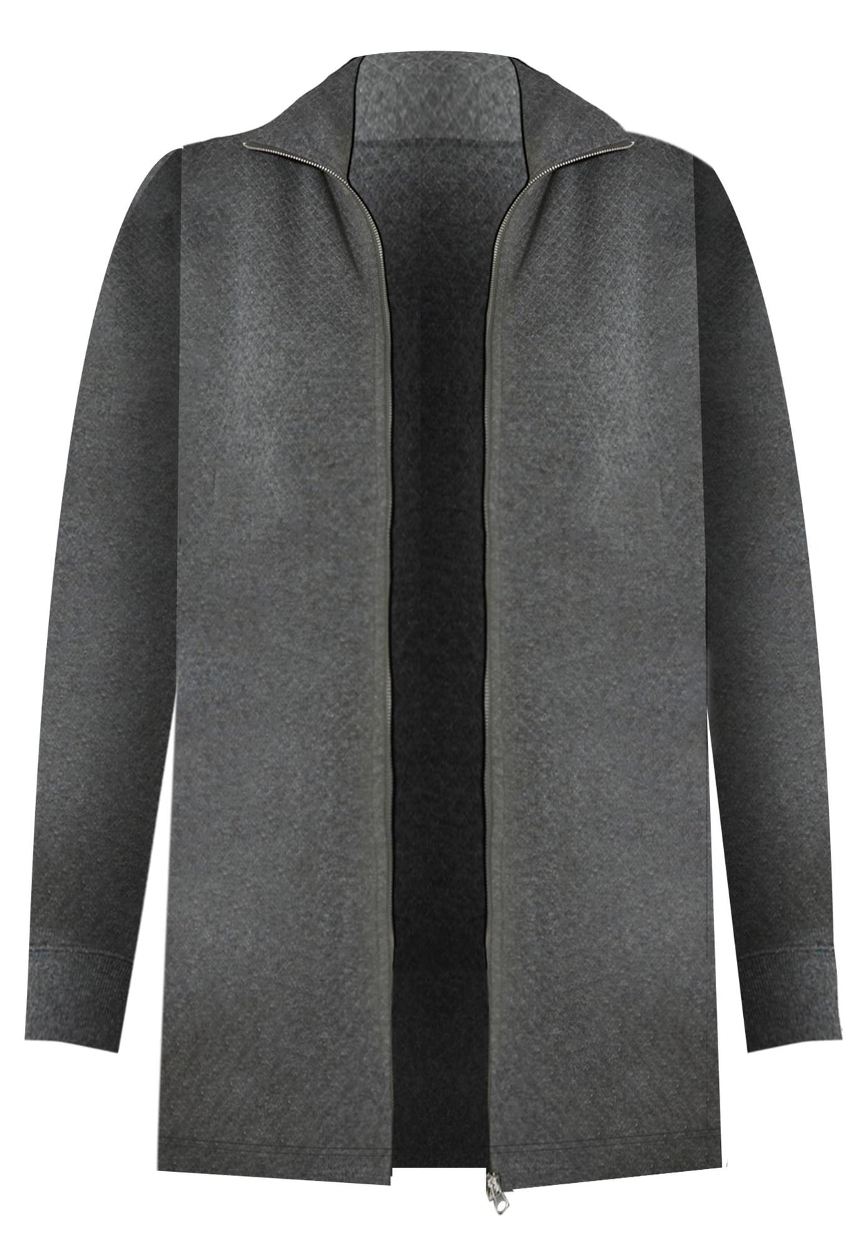 FIT: Relaxed and easy fit. Zip front with foldover collar. Long sleeves. Rib trim at collar and cuff. Straight hem.