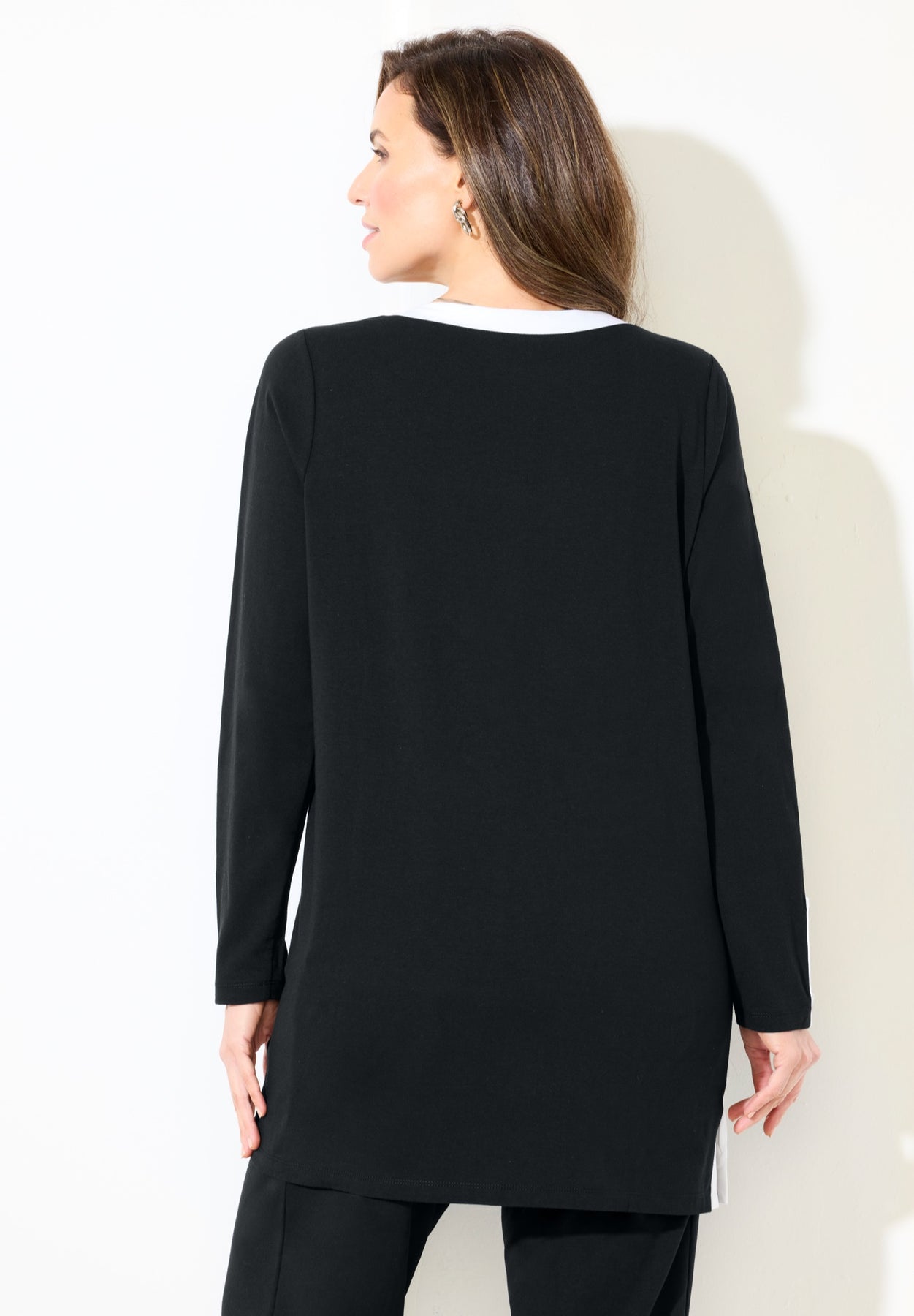 FIT: Effortless style, comfortable fit. Contrast trim at the deep V-neckline, long sleeves and crossover side slits.