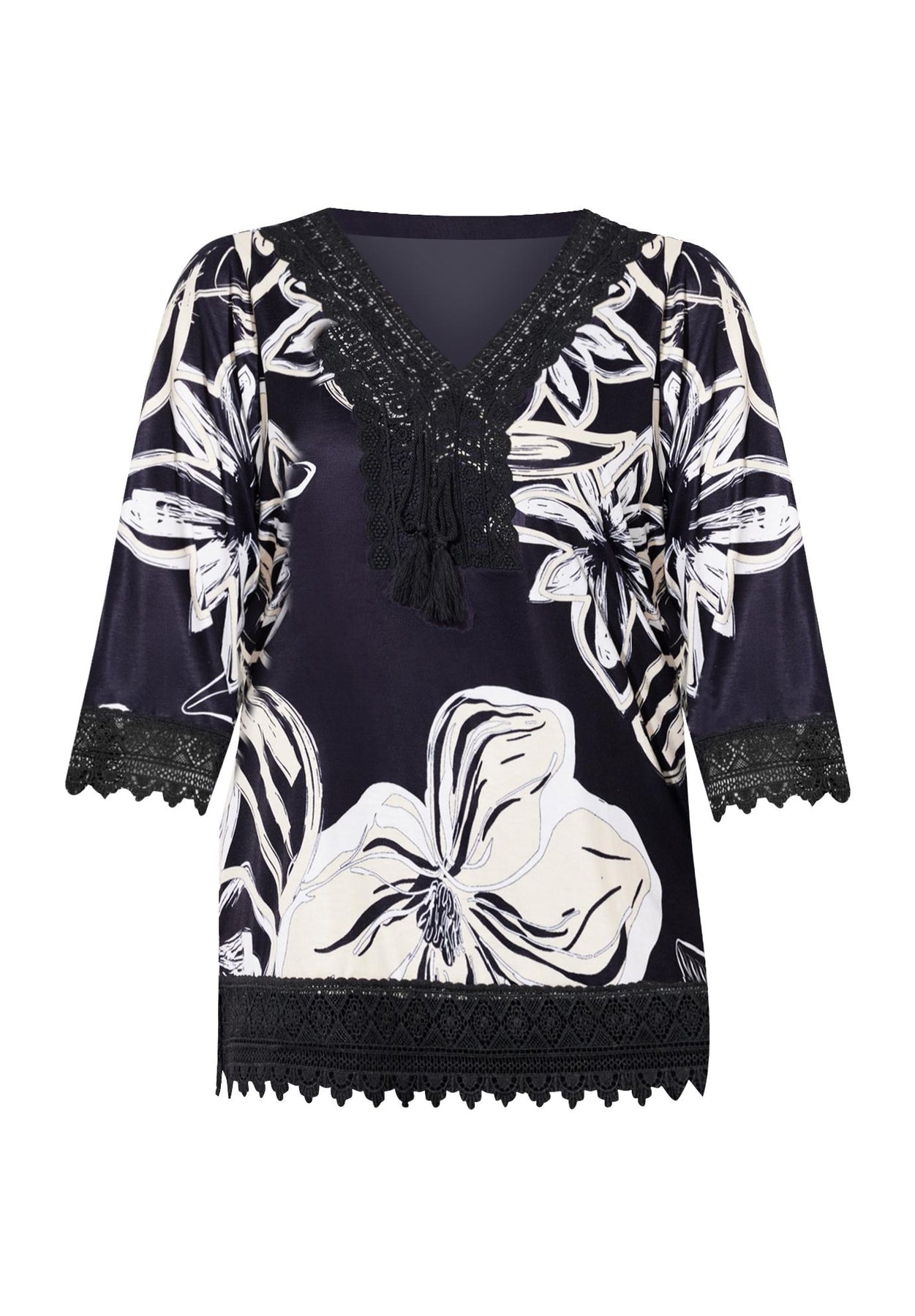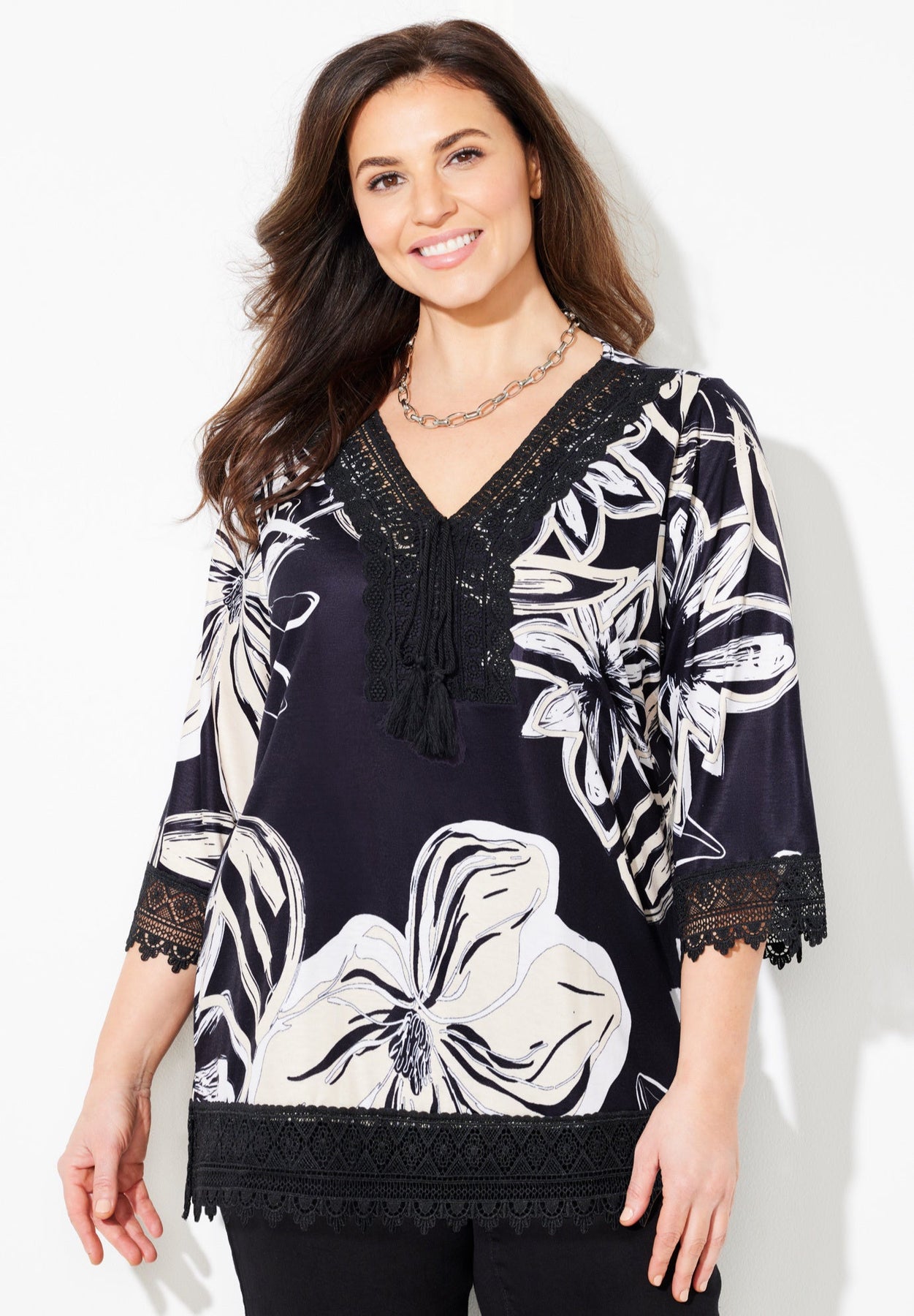 The crochet trim on this tunic transforms it into a style with boho chic attitude. It has a relaxed fit and easy drape. V-neckline with tassel ties and three-quarter length sleeves with side slits at hem. It’s a perfect pairing with our Knit Jean or Capri.