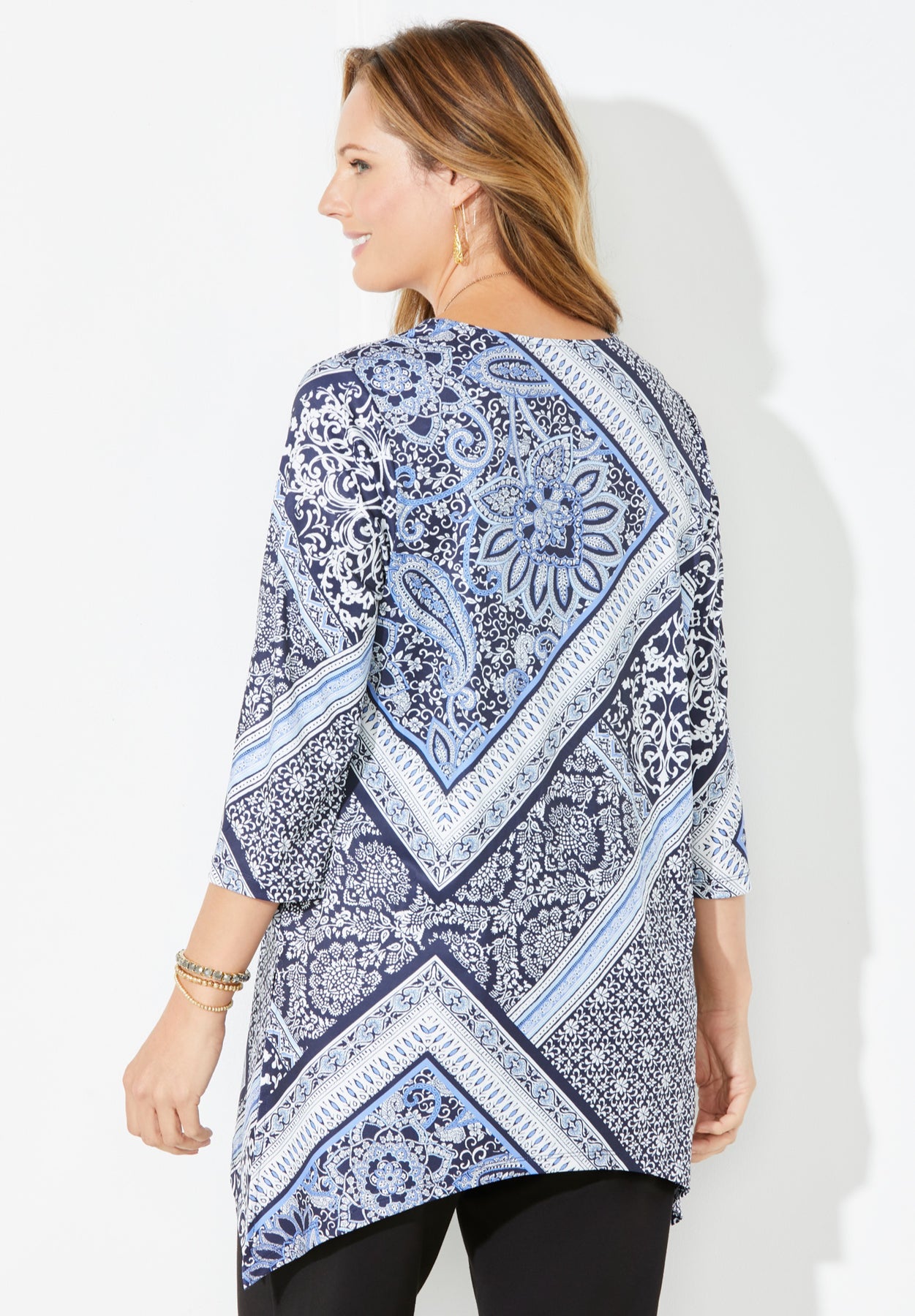 FIT: Relaxed and feminine tunic with an easy drape. V-neckline, 3/4 sleeves and slimming two-point hem with side slits.