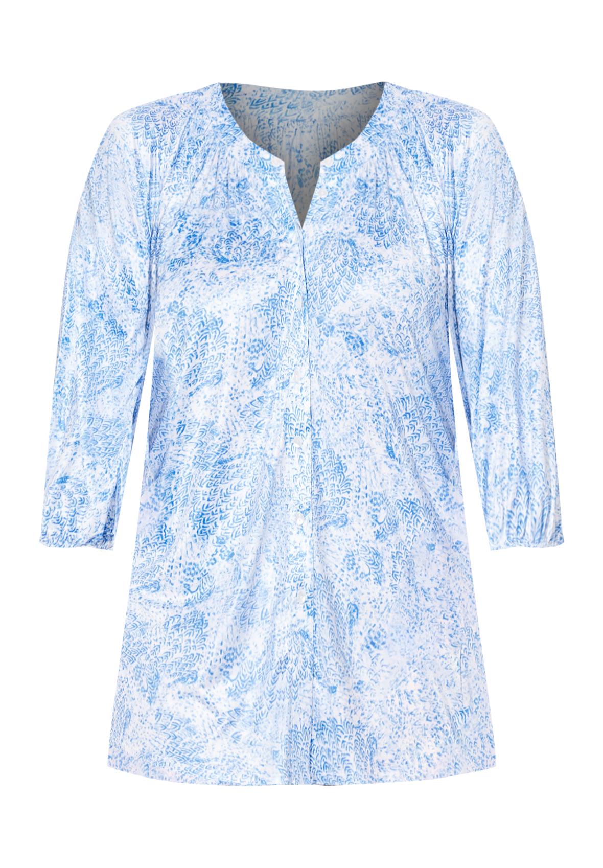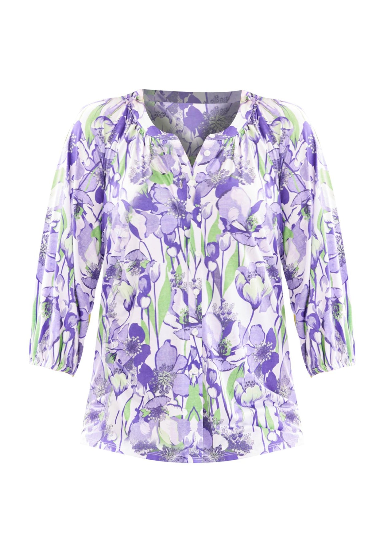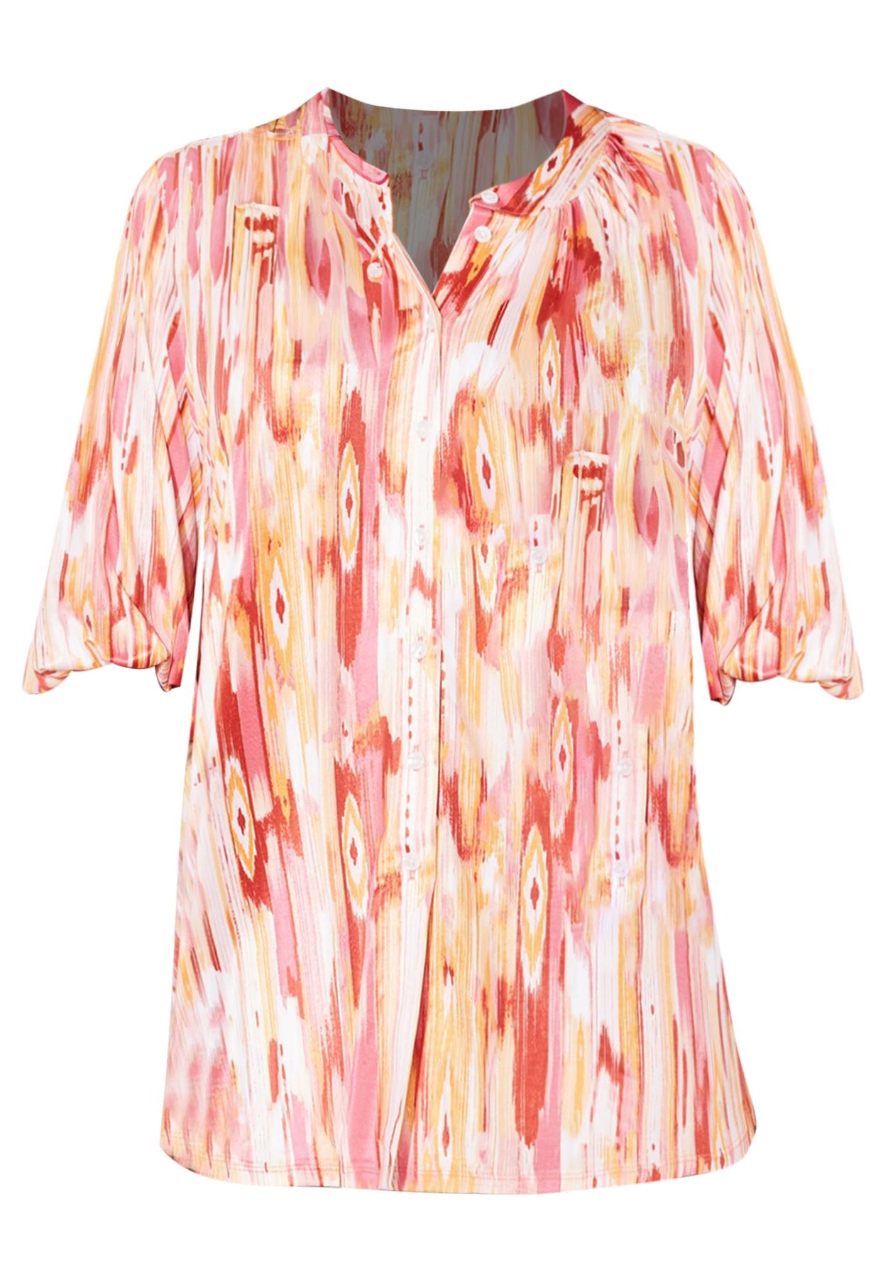 FIT: Roomy fit, flow-y drape. Scoop neckline, buttonfront, three-quarter length sleeves with encased elastic at sleeve’s opening.