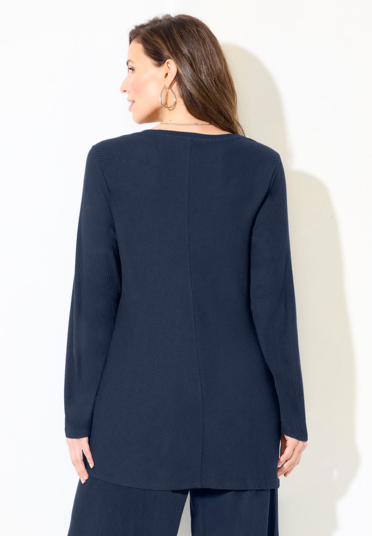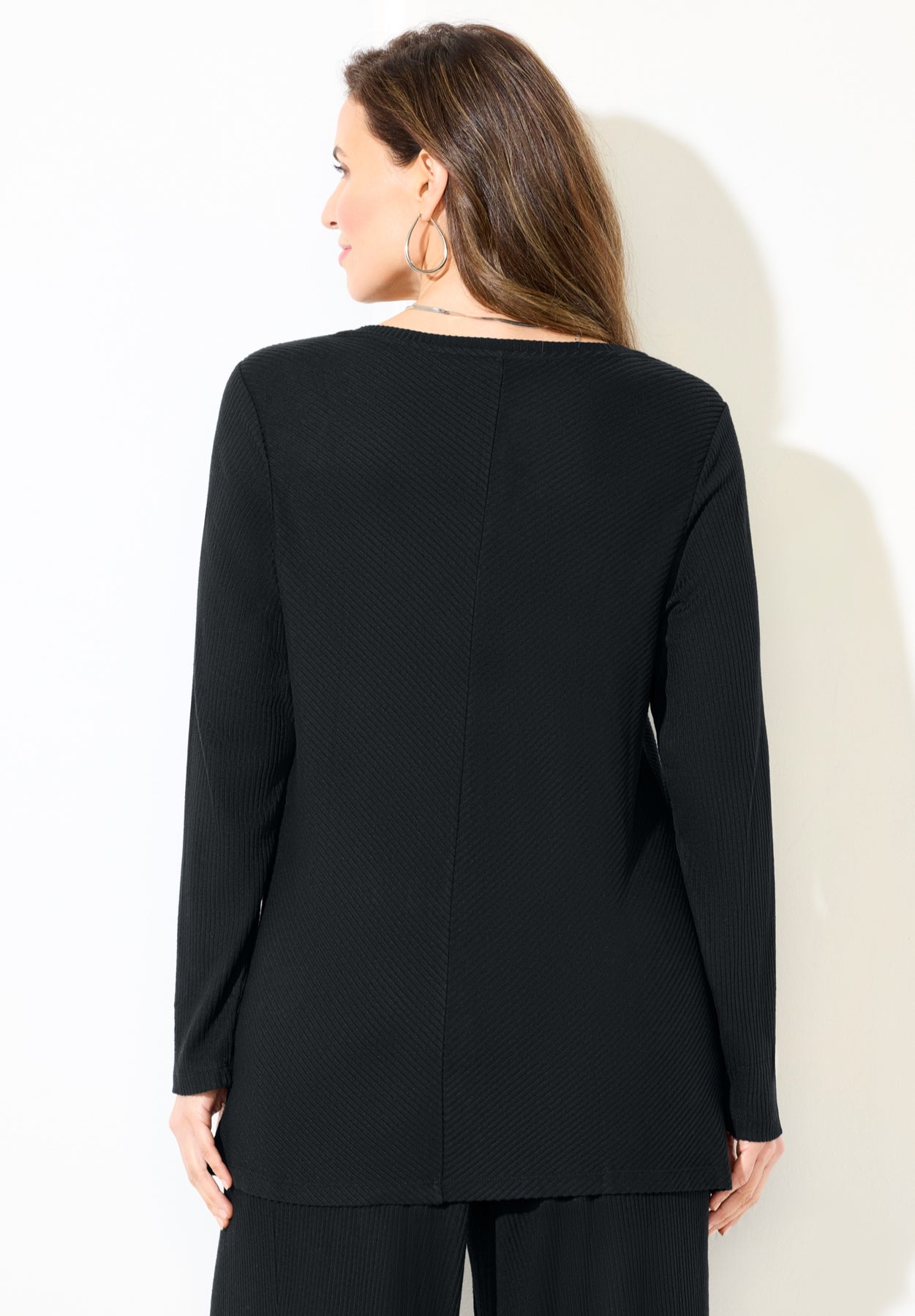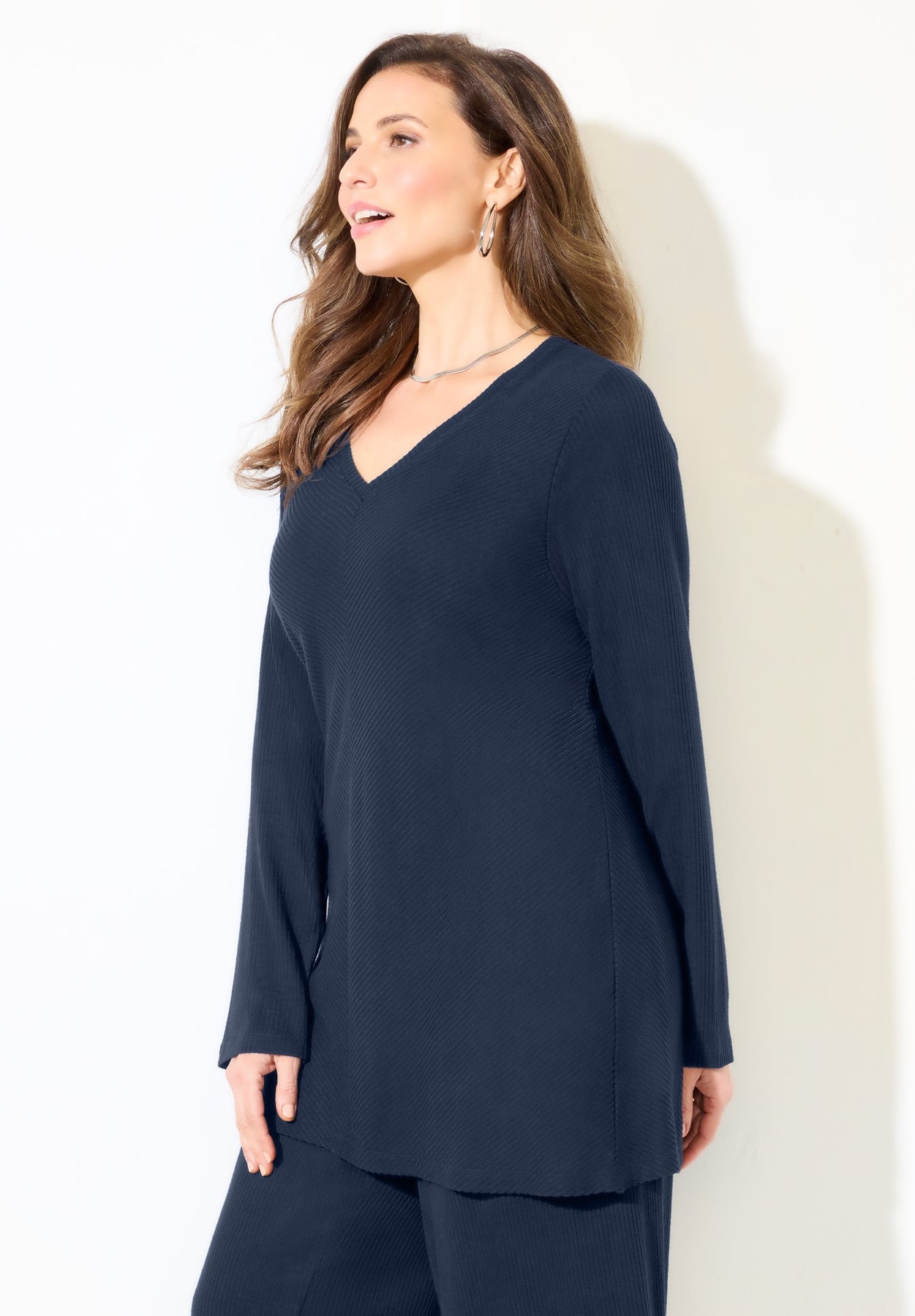 Part of our AnyWear exclusive collection of travel-ready separates made to mix, match and make life easy. This top has a easy-going attitude that gives it an effortless chic look. It’s designed with ultra-soft Hacci knit fabric that provides a sumptuous coziness that makes wearing it feel like an everyday luxury. The ribbed texture gives it stylish depth and the V-neckline lets just a simple change of accessories transition your look from day to nighttime dressing. A perfect match with our AnyWear Wide Leg Hacci Ribbed Pant.