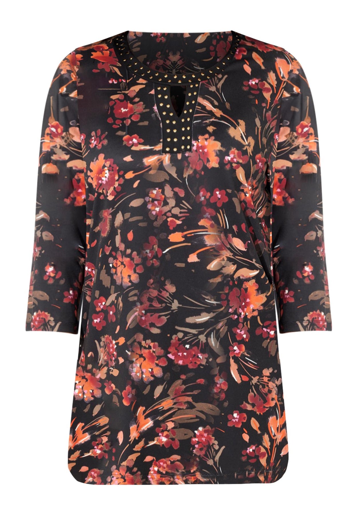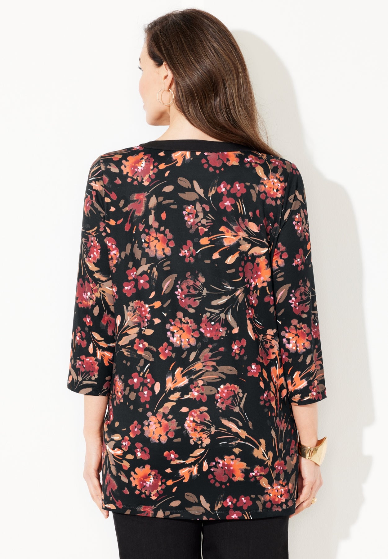 FIT: Easy, relaxed silhouette. Effortless style. Designed with keyhole accented neckline, three-quarter length sleeves and 3” side slits.