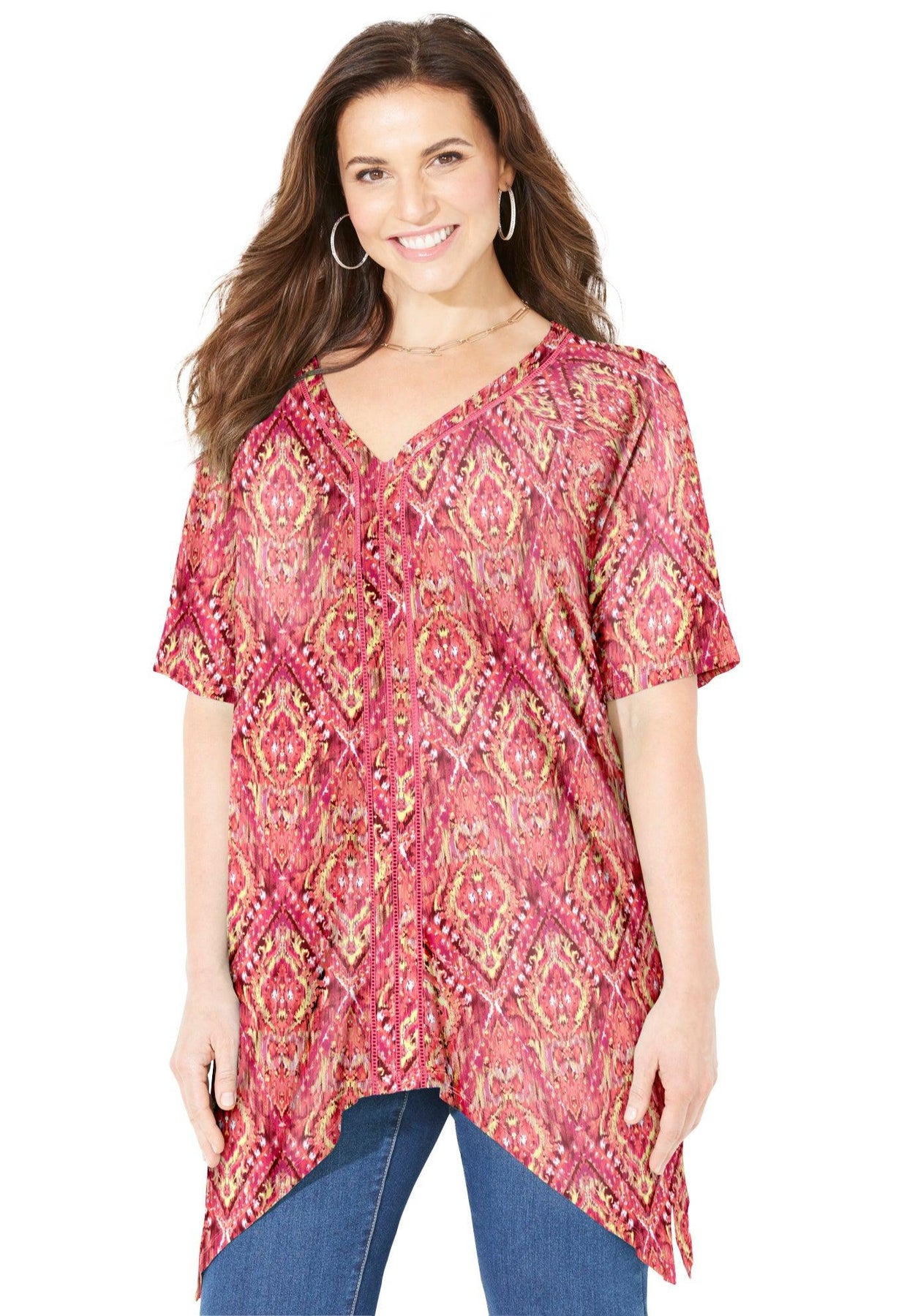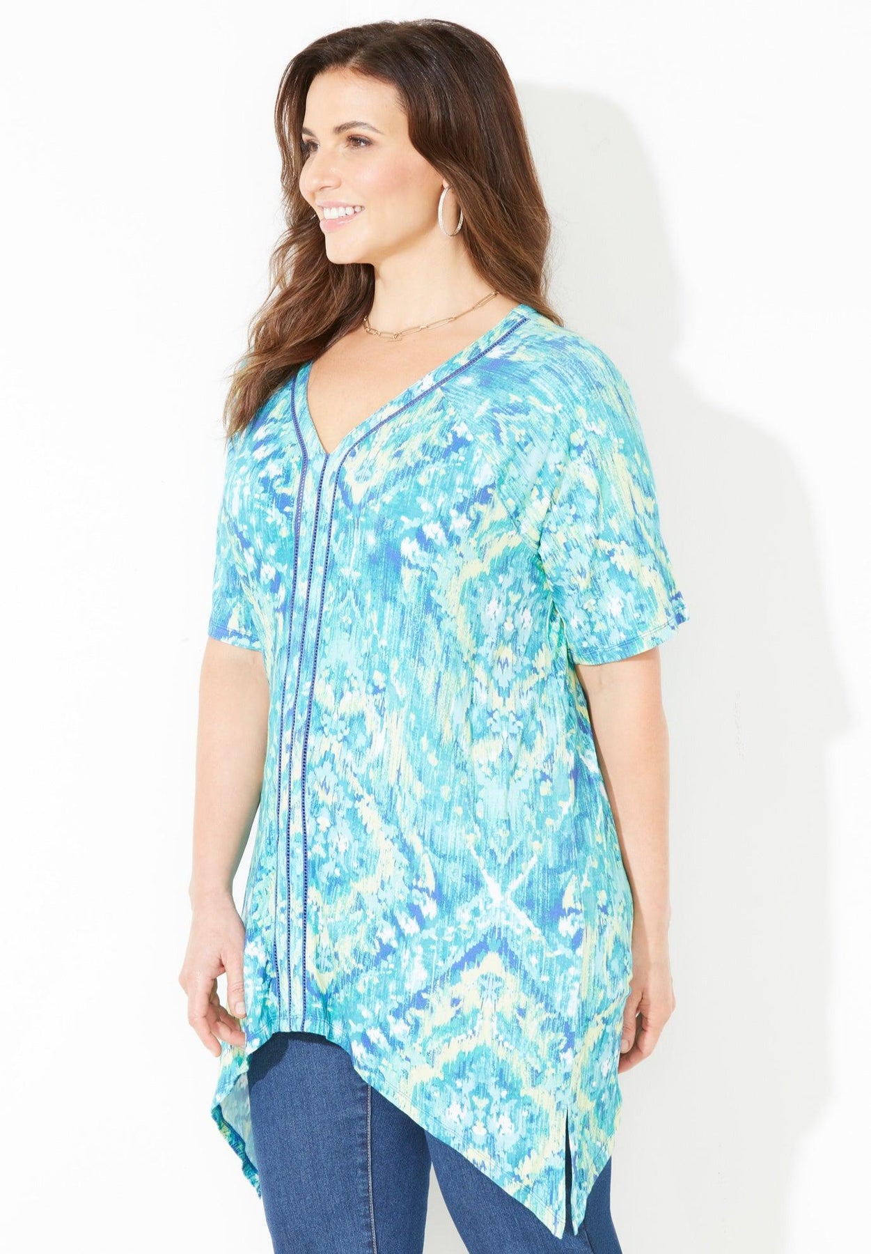 FIT: Relaxed fit with short raglan sleeves, embroidered trim and shark-bite slit hem.