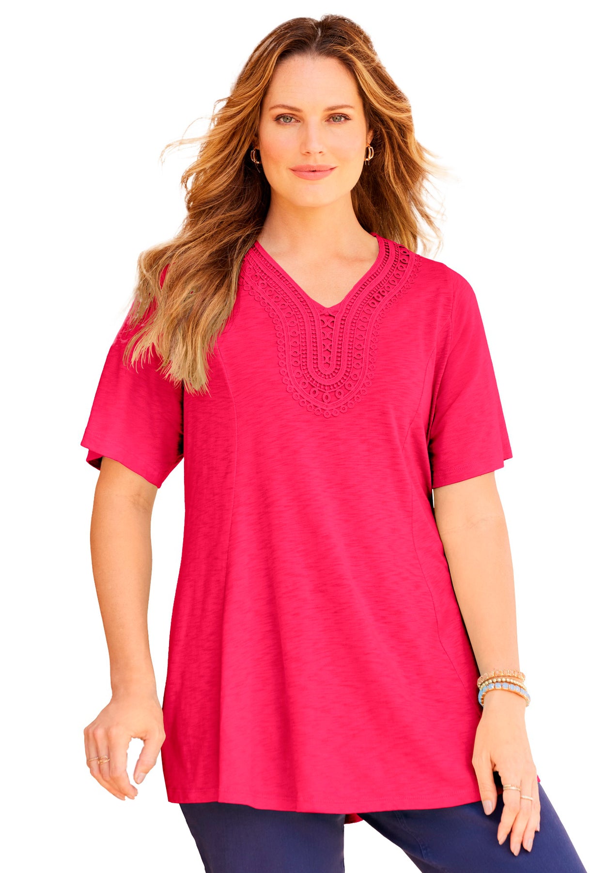 FIT: Easy silhouette with gentle swing and sway. V-neck. Short sleeves. Longer length for added coverage and comfort.