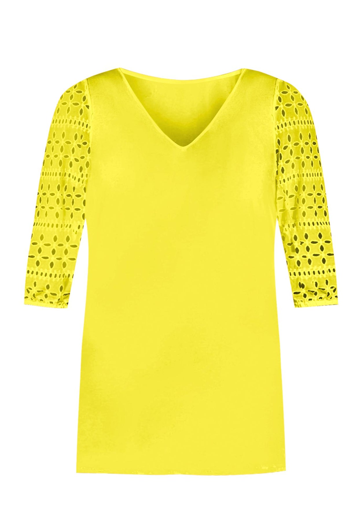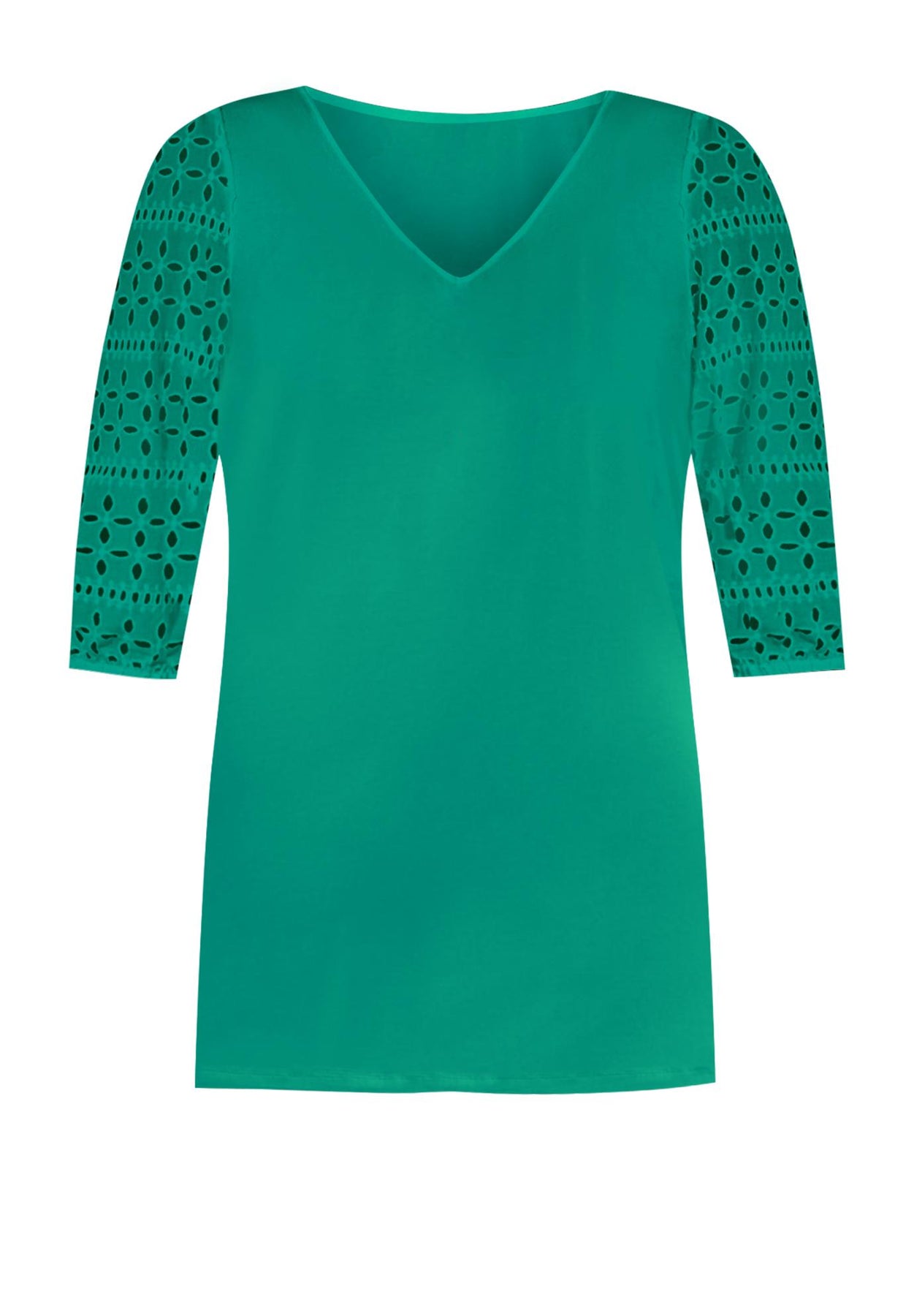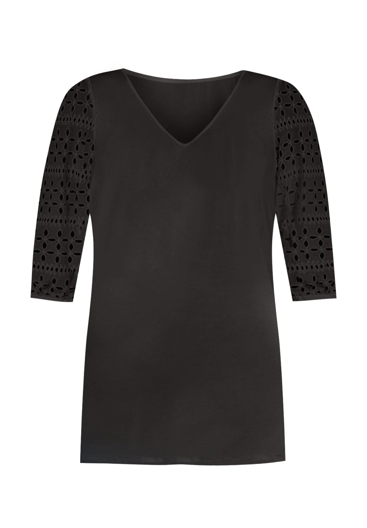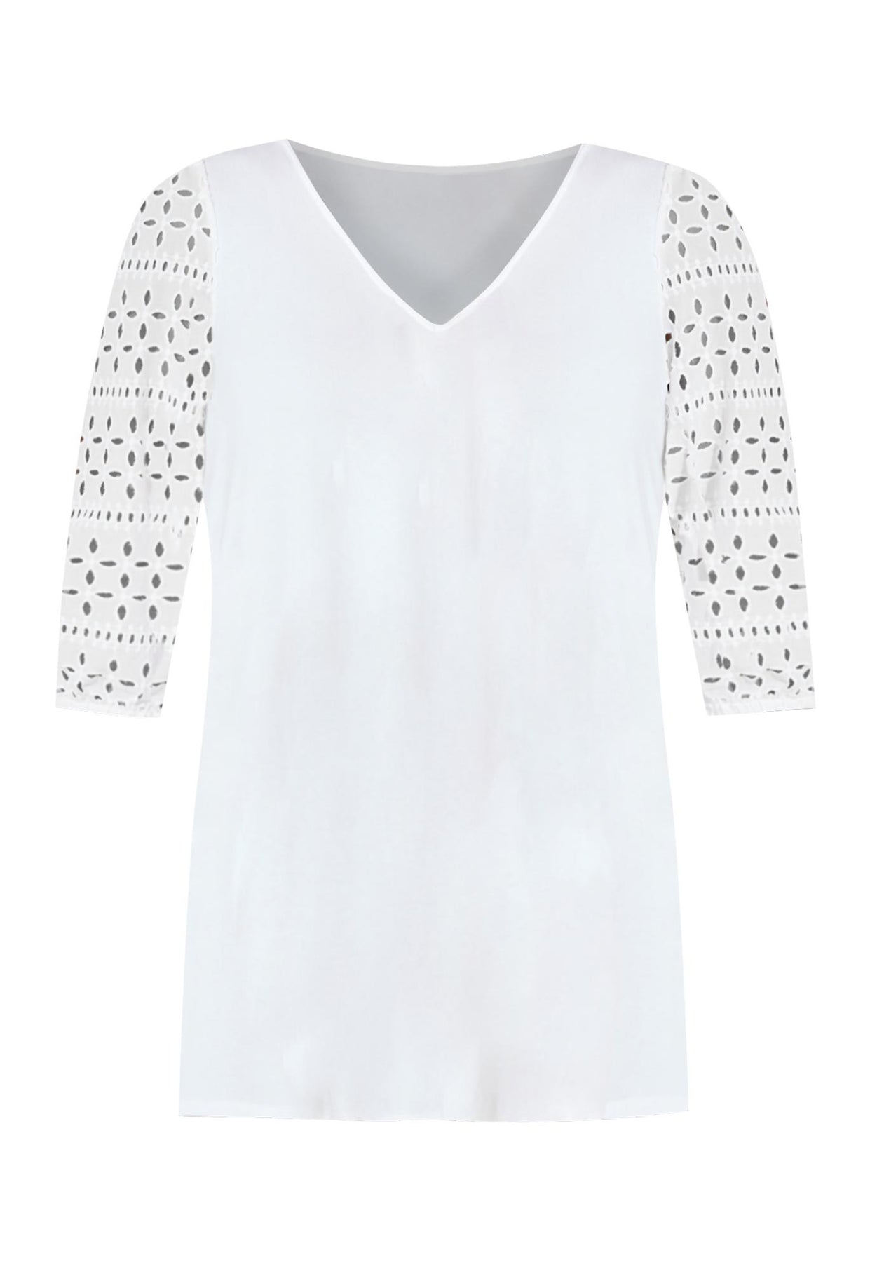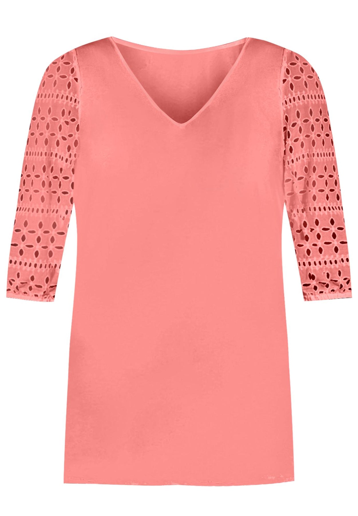 FIT: Relaxed and easy with a good amount of stretch. V-neckline, three-quarter eyelet sleeves, and straight hem.