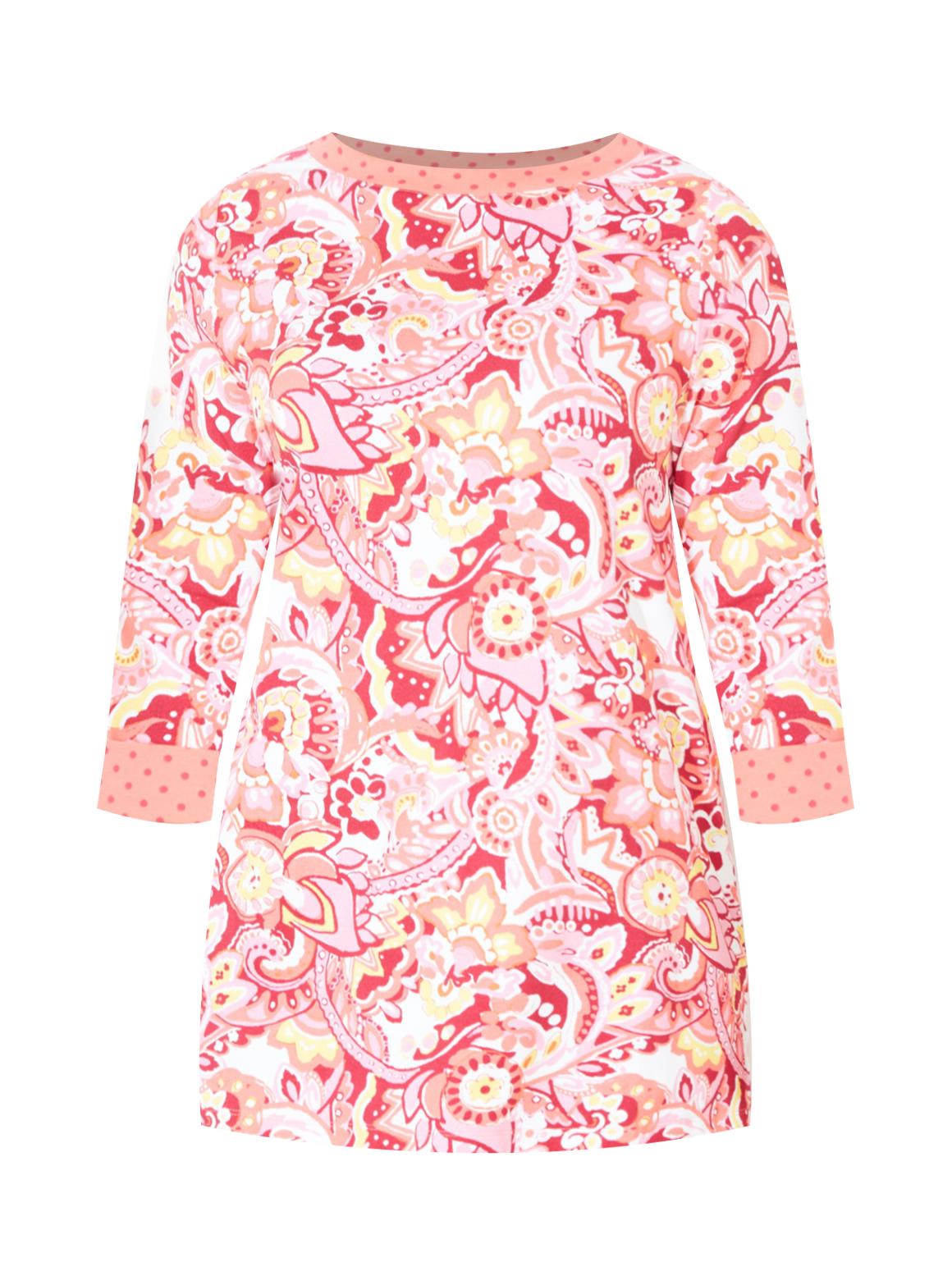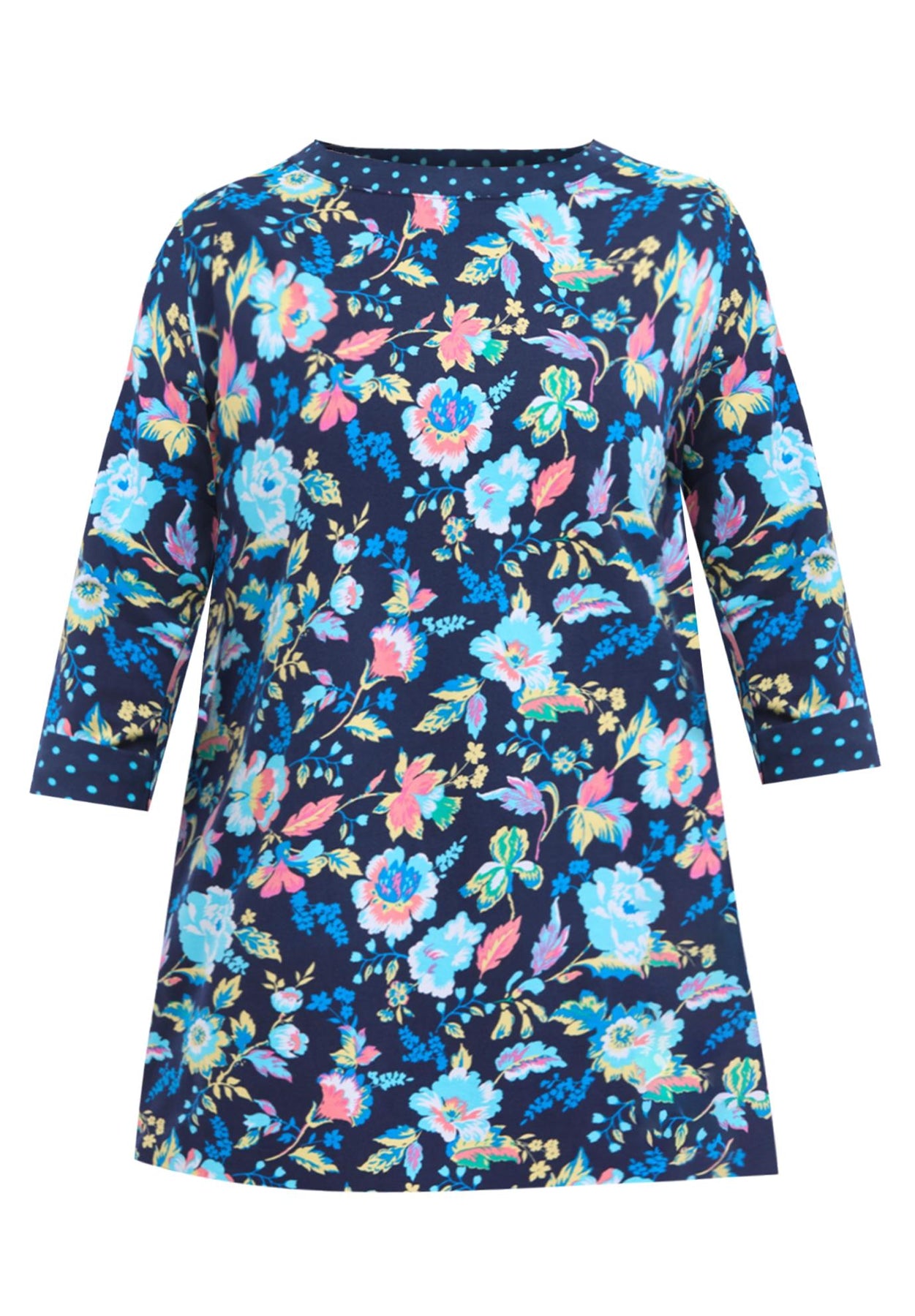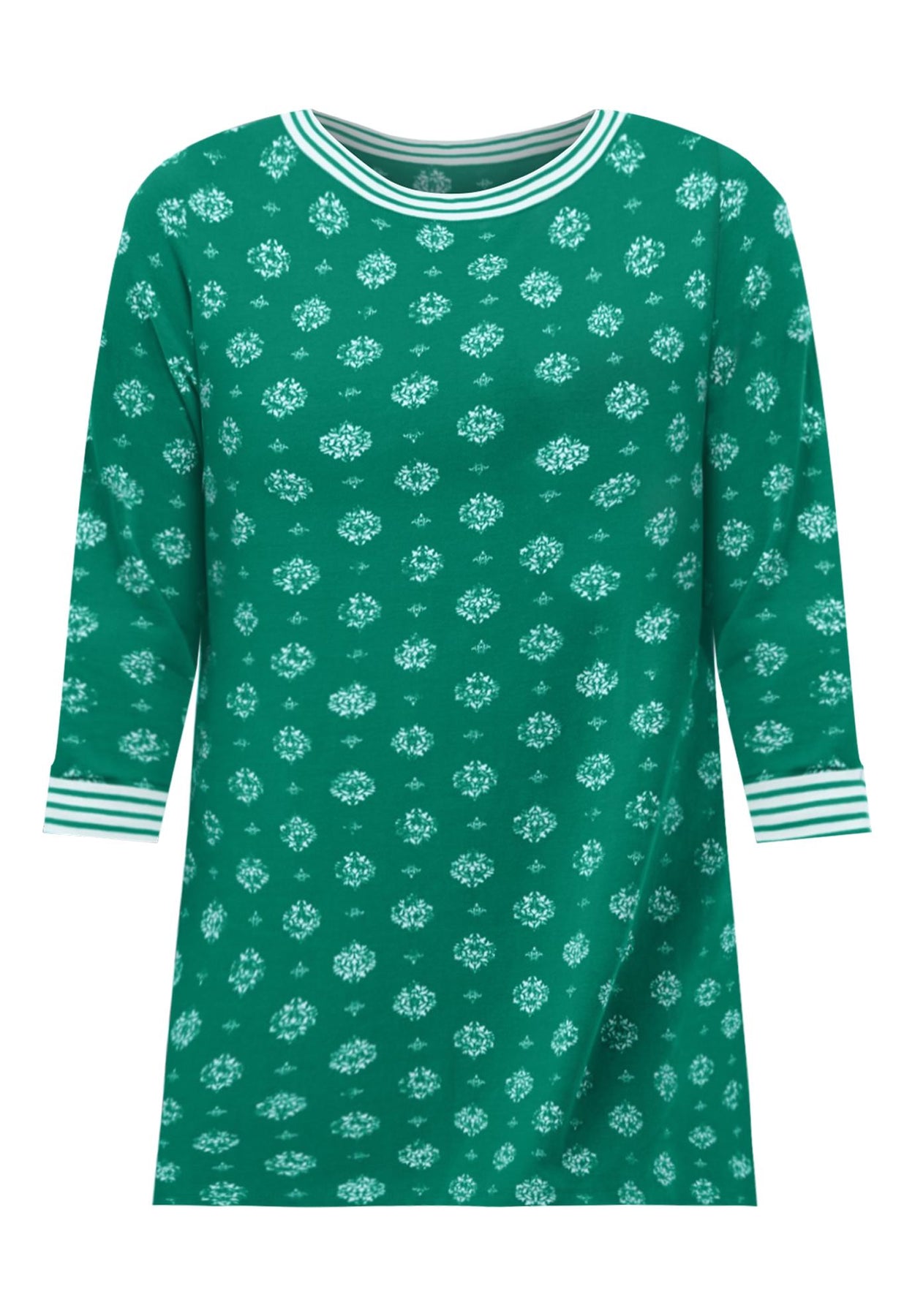 FIT: Relaxed and easy silhouette with flattering boat neckline and twin-print detail at neckline and sleeve. 3/4 sleeves.
