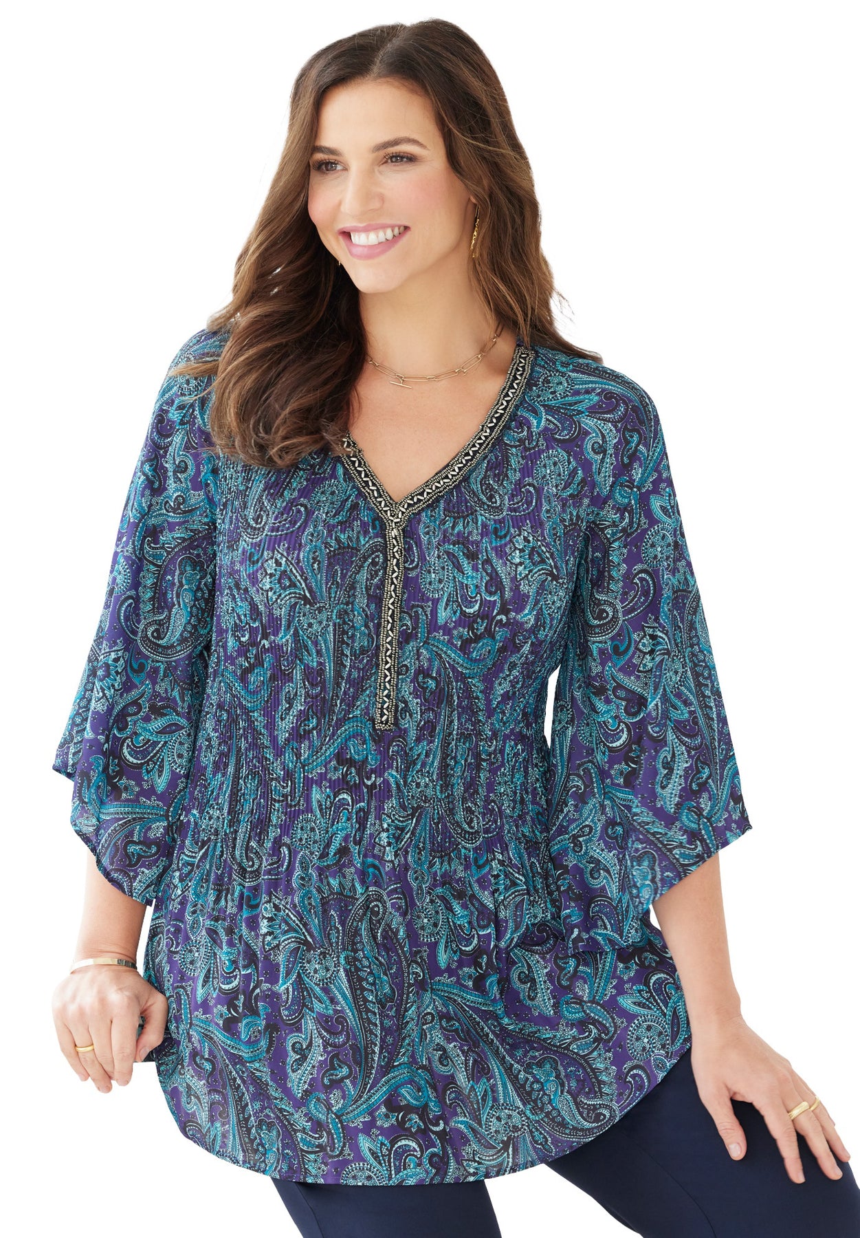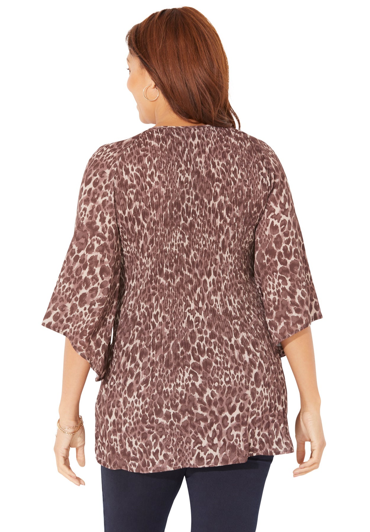 Soft, relaxed and refined with a Y-neckline, raglan armholes and wide 3/4-length "angel" sleeves that flutter and sway with every move. Vertical pleats create even more ease and flattery.