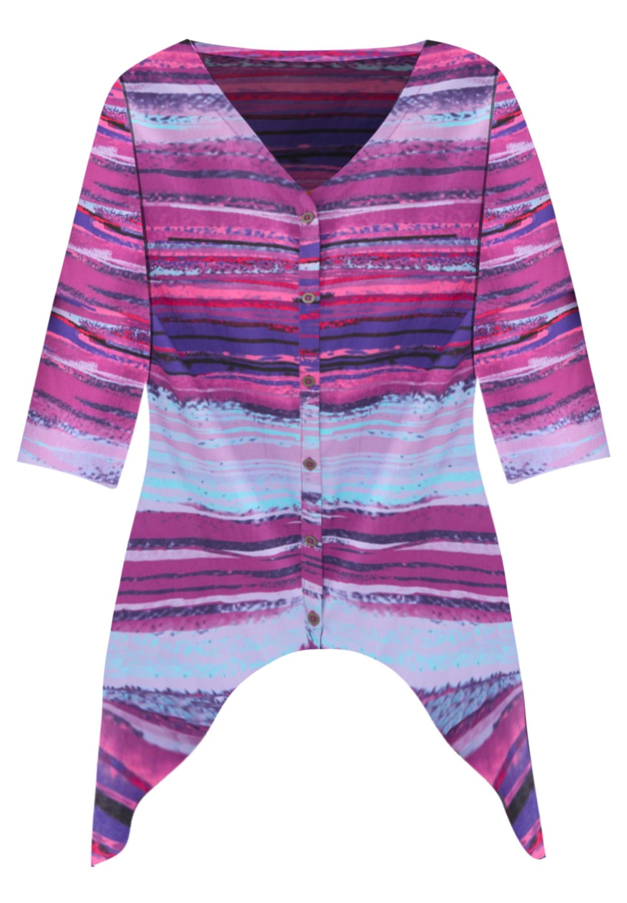 FIT: Relaxed and feminine buttonfront silhouette with notch neckline, elbow-length sleeves and dramatic two-point hem.