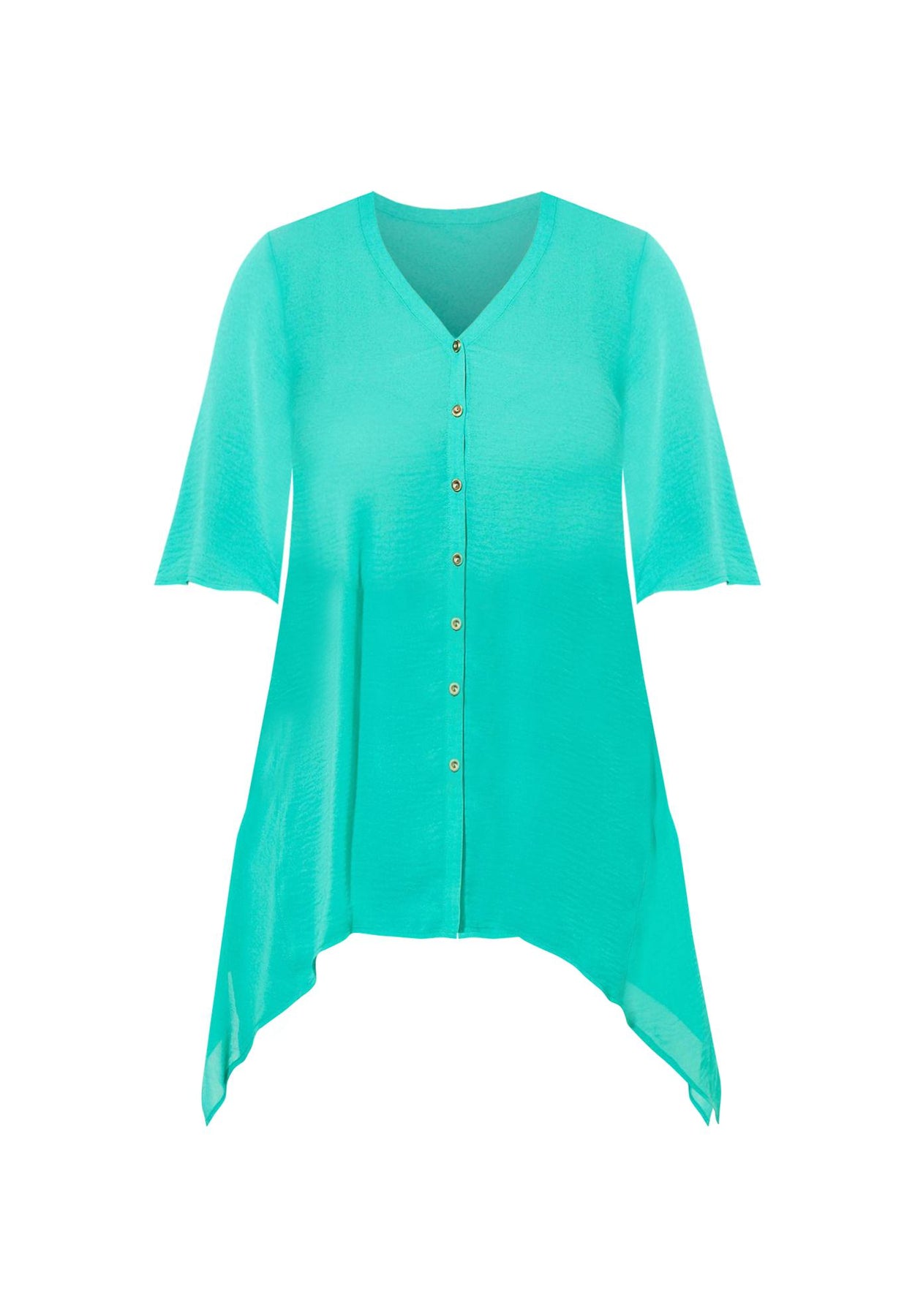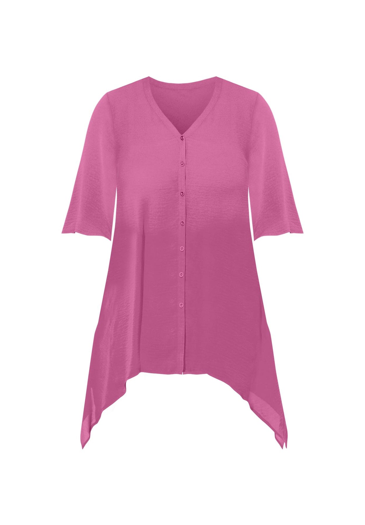 This easy buttonfront is pure figure flattery. Pebbled crepe fabric floats over your curves, while the two-point hem visually slims your shape. Wear it with a slim-leg jean or pant for a long-over-lean effect.