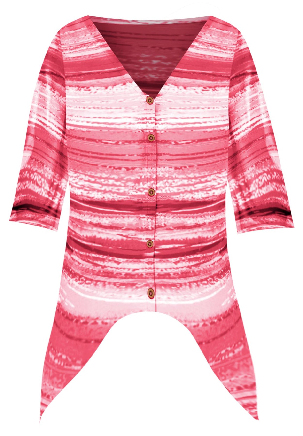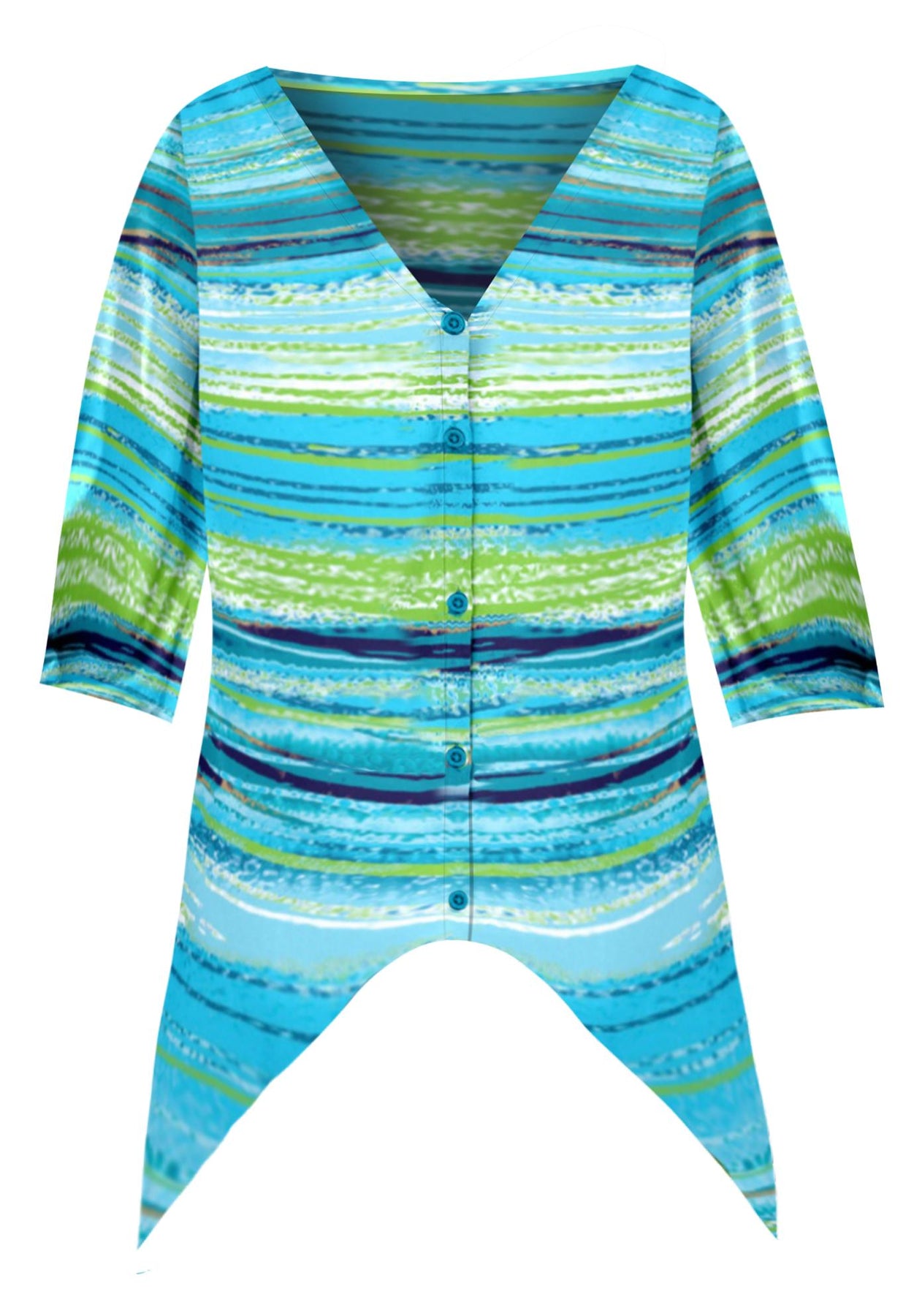 FIT: Relaxed and feminine buttonfront silhouette with notch neckline, elbow-length sleeves and dramatic two-point hem.