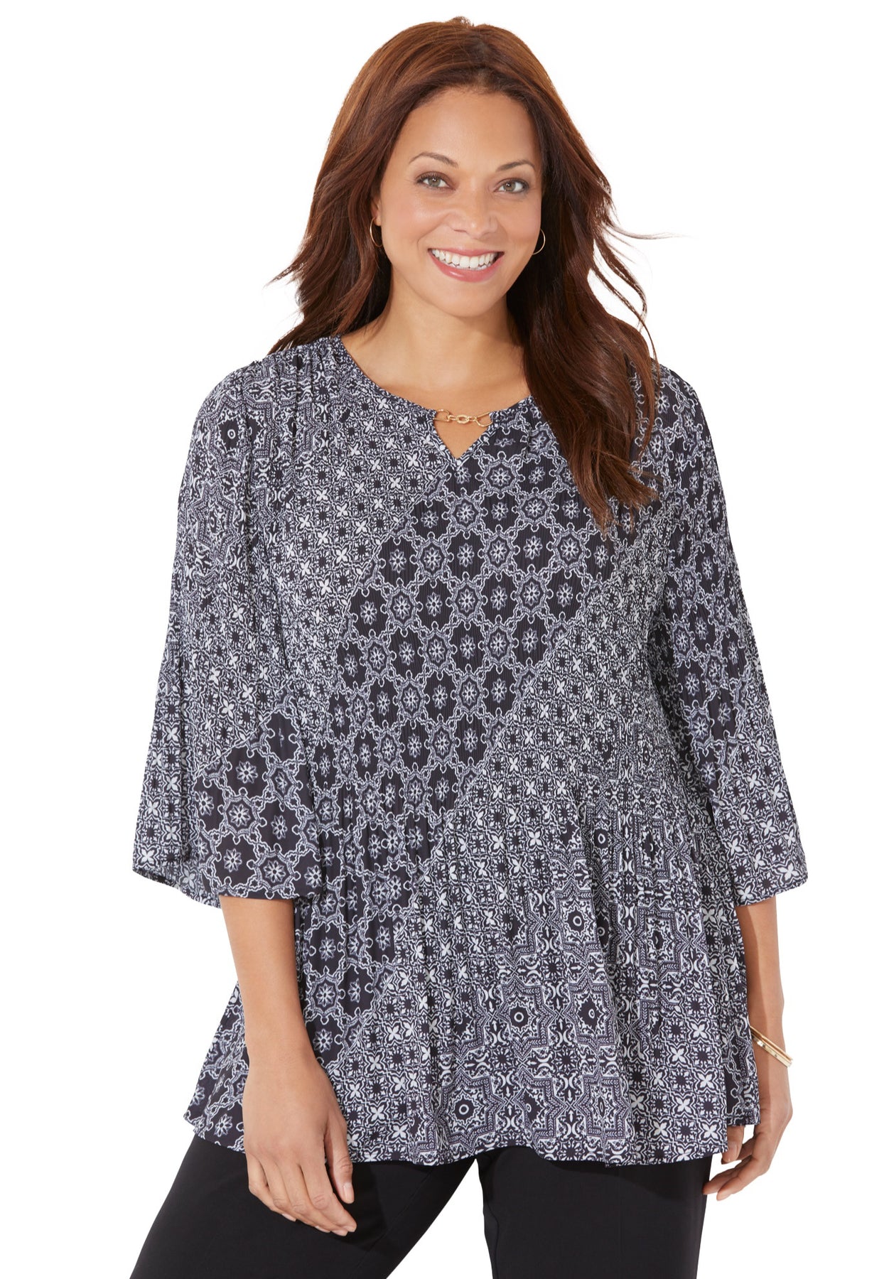FIT: Relaxed, yet refined. Soft, forgiving pleats float over your curves for ultimate comfort. Keyhole neckline with chain detail. 3/4 angel sleeves. Tunic length.