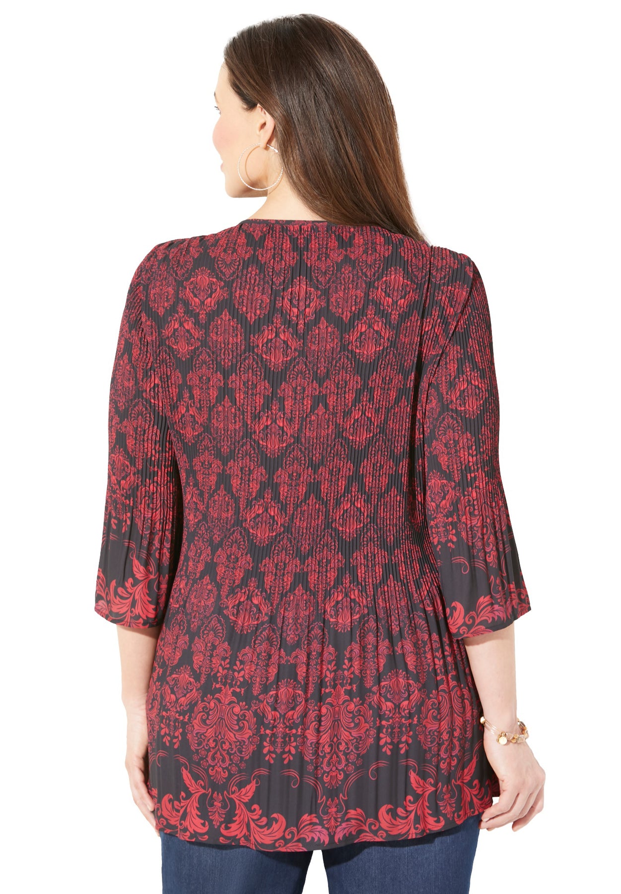 FIT: Relaxed, yet refined. Soft, forgiving pleats float over your curves for ultimate comfort. Velvet applique at the V-neckline. 3/4 angel sleeves. Tunic length.