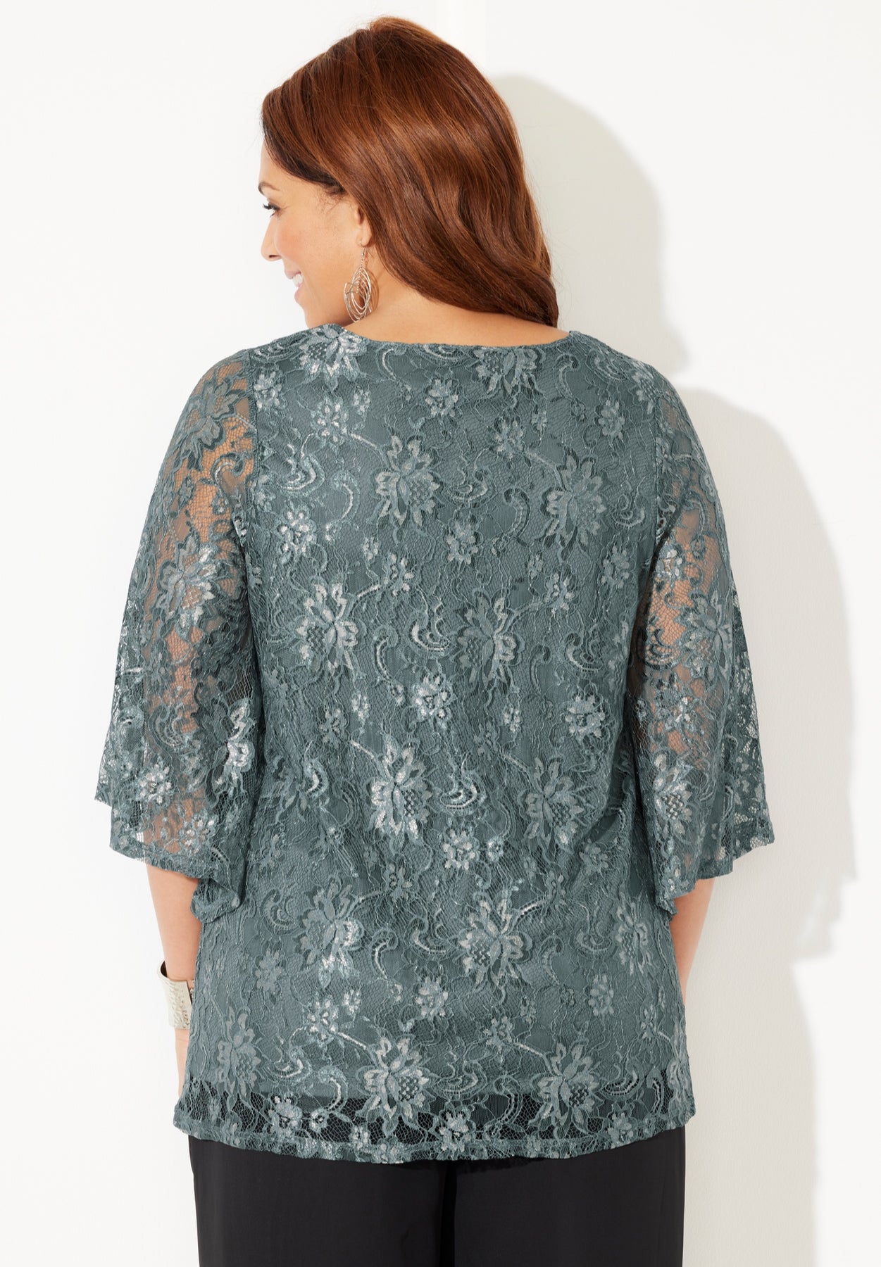We love the delicate romantic lace that give this blouse its alluring elegance. Then there’s the V-neckline, three-quarter length angel sleeves and the flowy drape that makes it so fitting to wear to your next soiree.