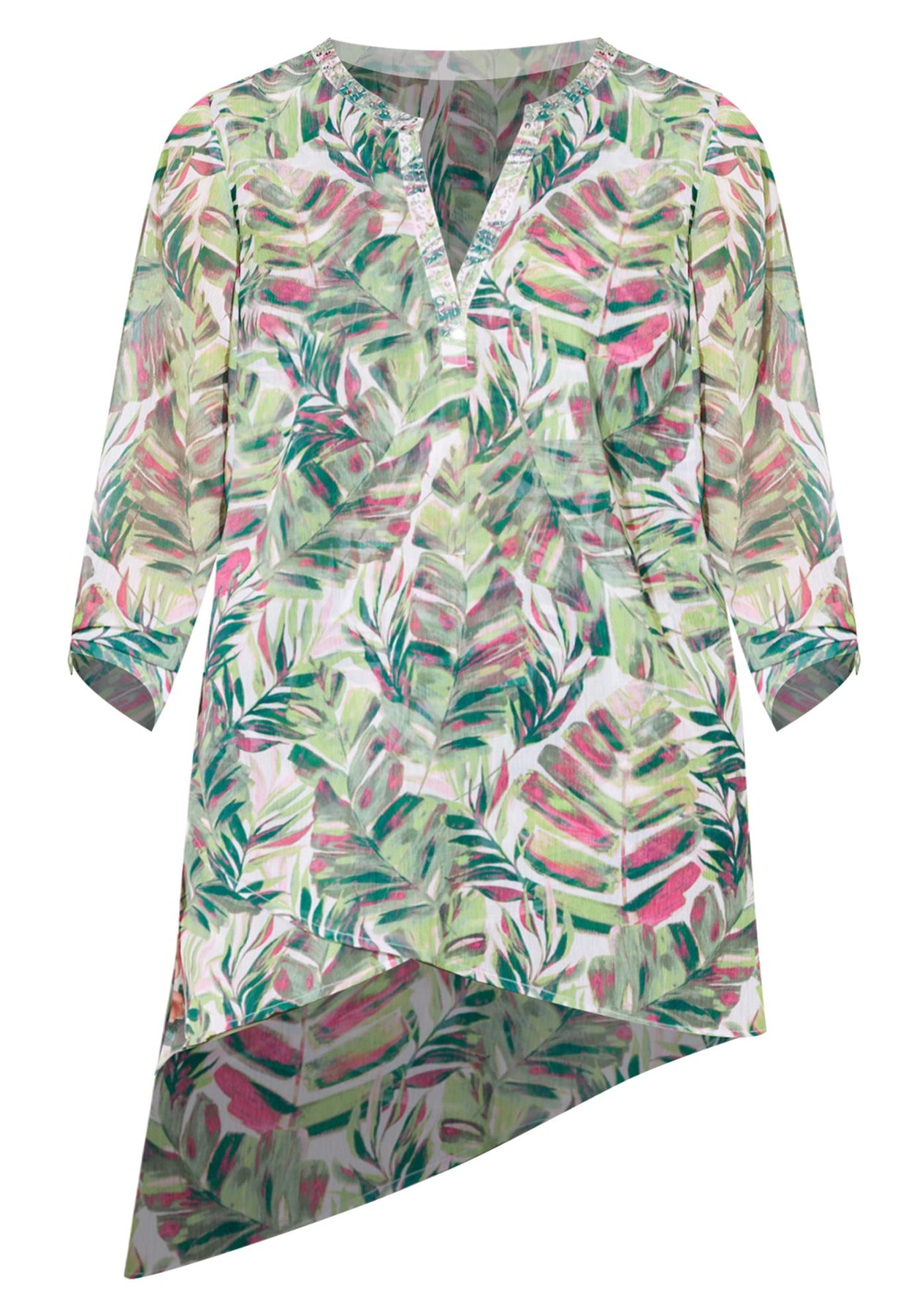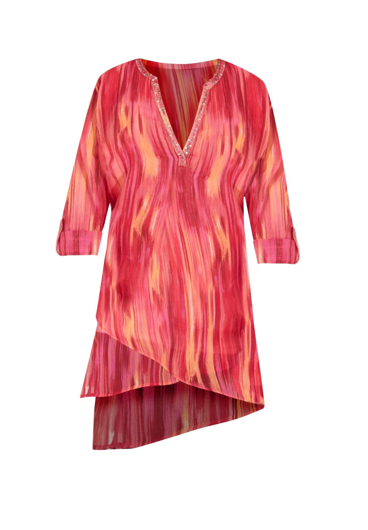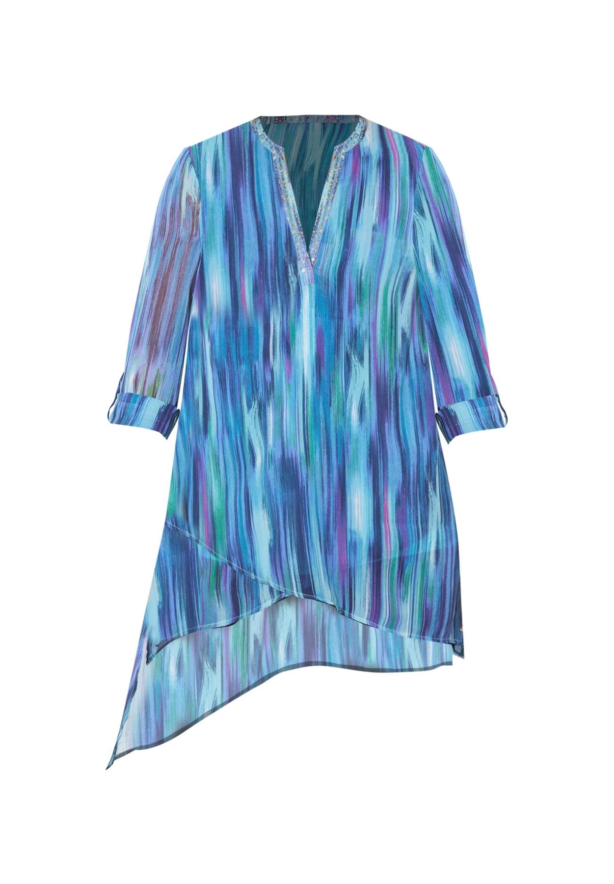 With its beautifully beaded neckline and gorgeous print, this asymmetrical tunic is the cornerstone of an artful wardrobe. Overlapping layers of soft, floaty fabric glide over your curves forming a tulip hem in front, with a longer drape in back. An absolute must-have!