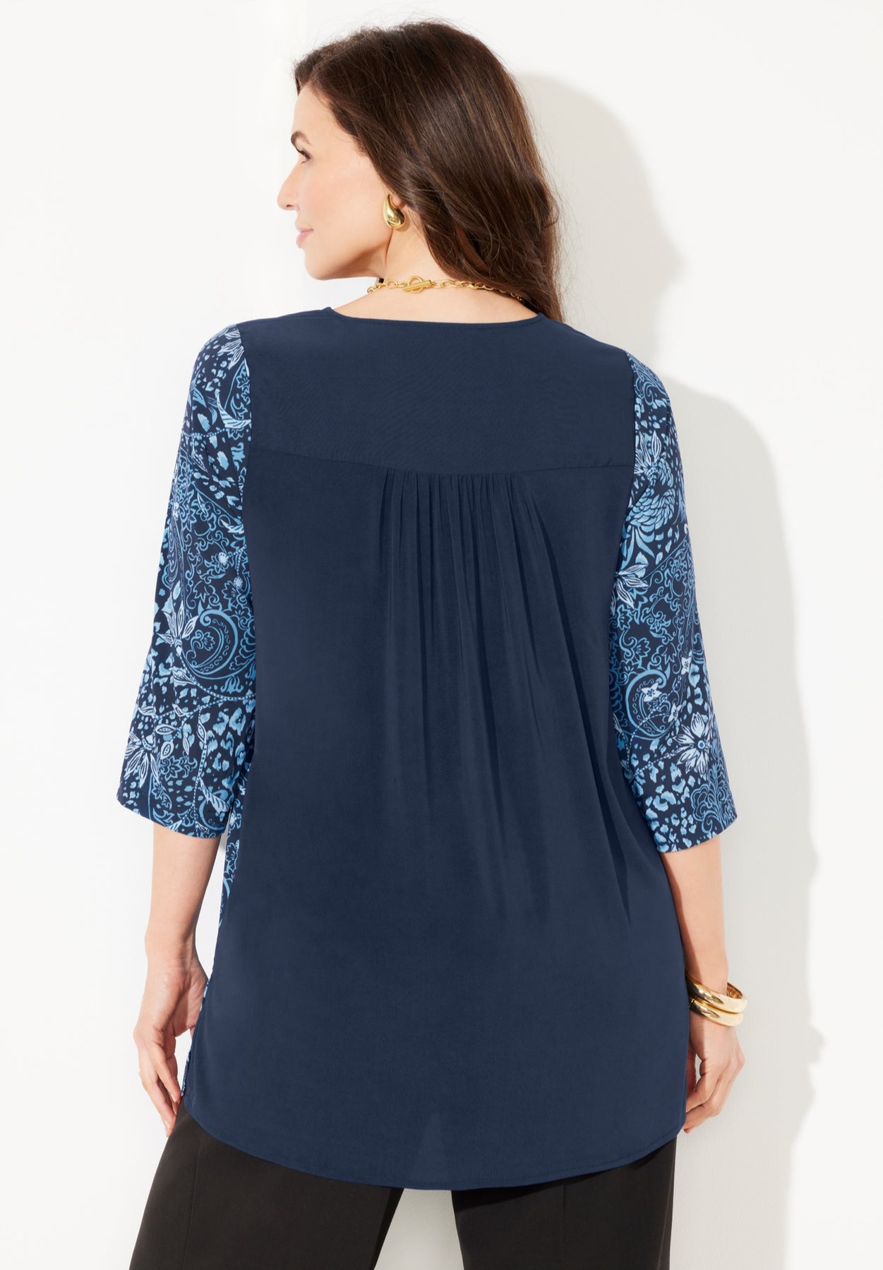 FIT: Feminine, relaxed silhouette. Pleated front, shirred back yoke, three-quarter length, faux roll-tab sleeves, and 5” side slits at the straight hem.