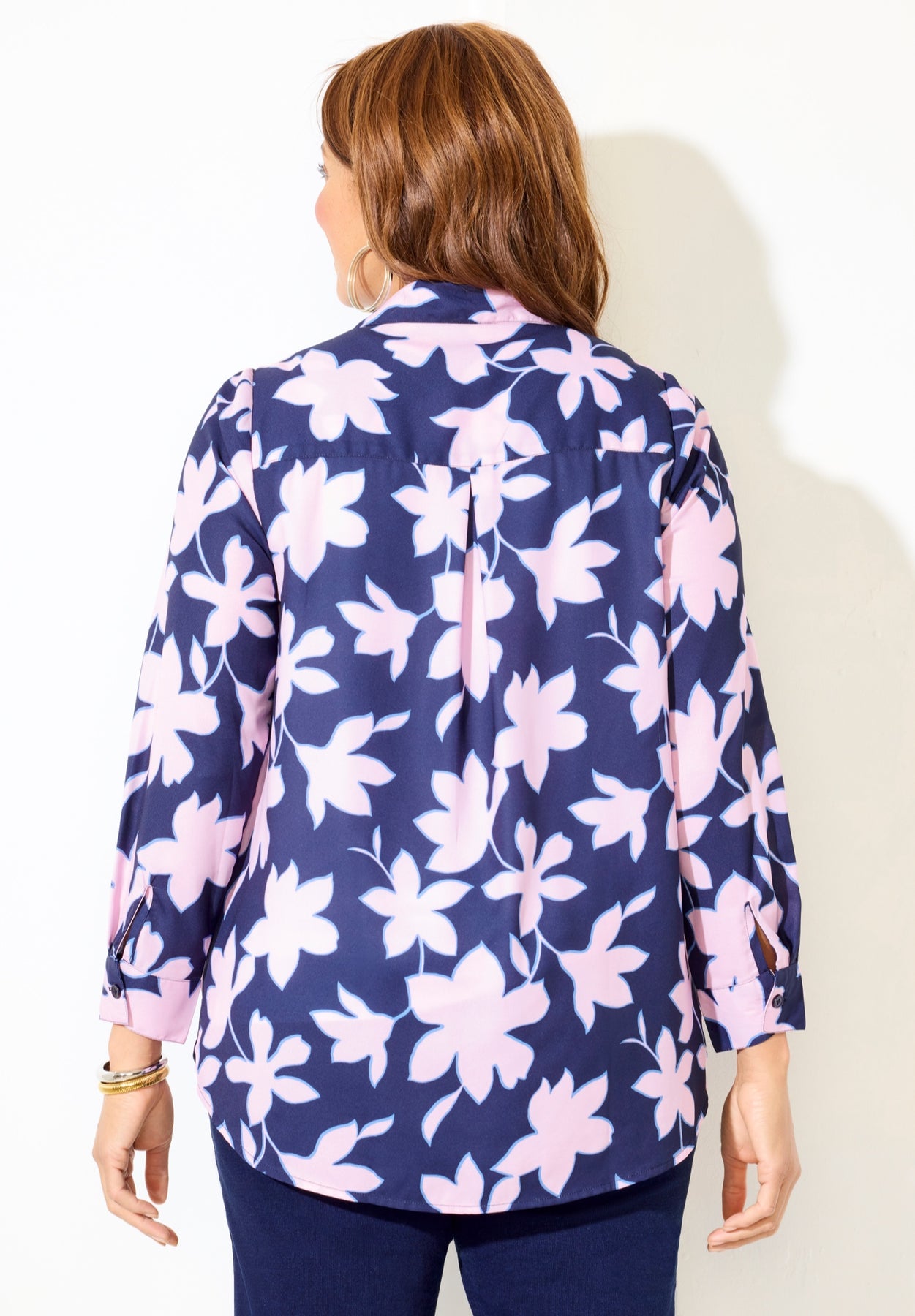 FIT: Relaxed, easy fit. V-neckline shirt collar, buttonfront, button-cuff long sleeves, flap patch chest pockets, and side slits at high-low shirt tail hem. Shirring detail.