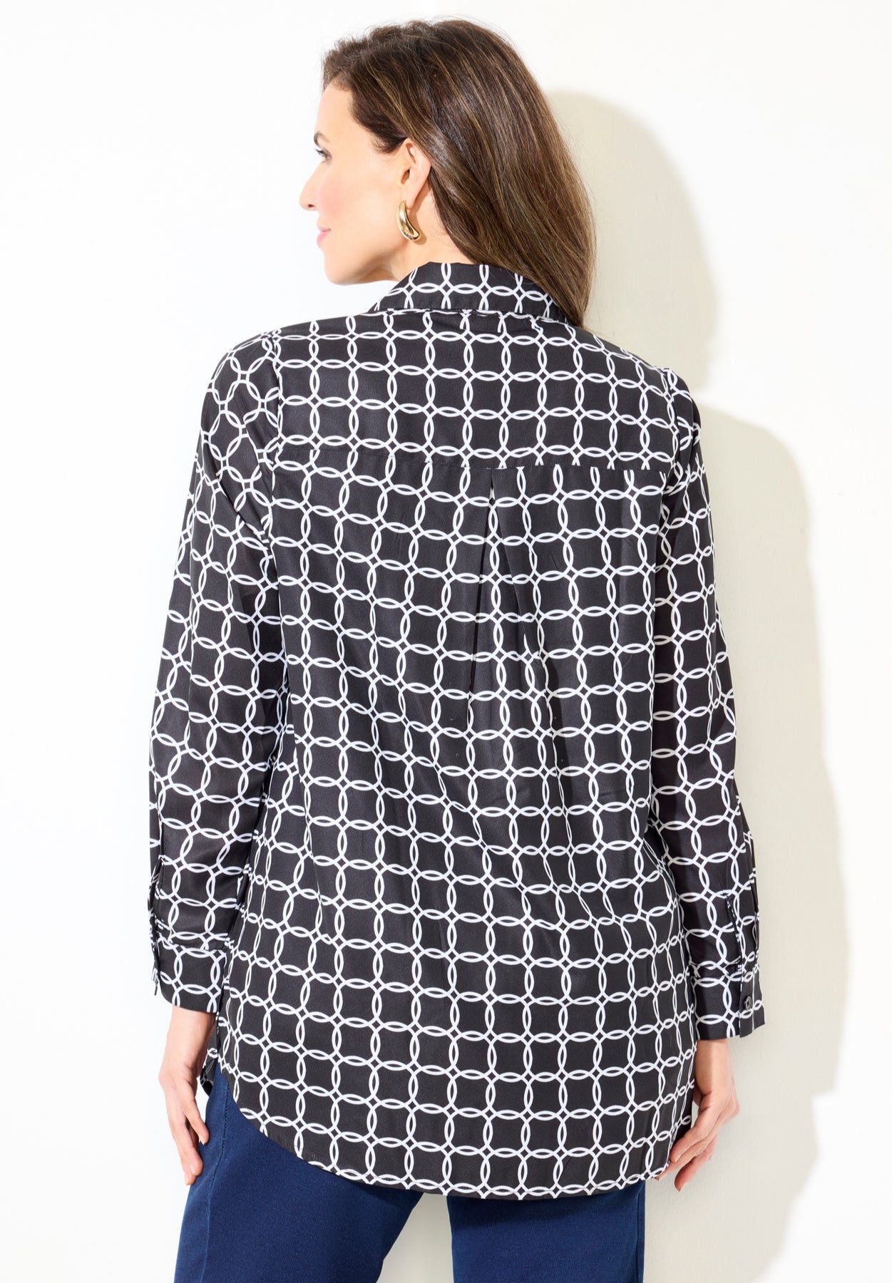 FIT:  Relaxed, easy fit. V-neckline shirt collar, buttonfront, button-cuff long sleeves, flap patch chest pockets, and side slits at high-low shirt tail hem. Shirring detail.