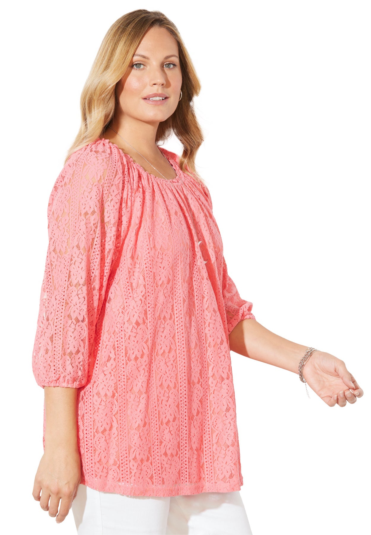 It's the peasant silhouette you love, rendered in soft stretch lace for a beautifully elevated look. We'd wear this style with a sleek Sateen Stretch Pant for a night out.