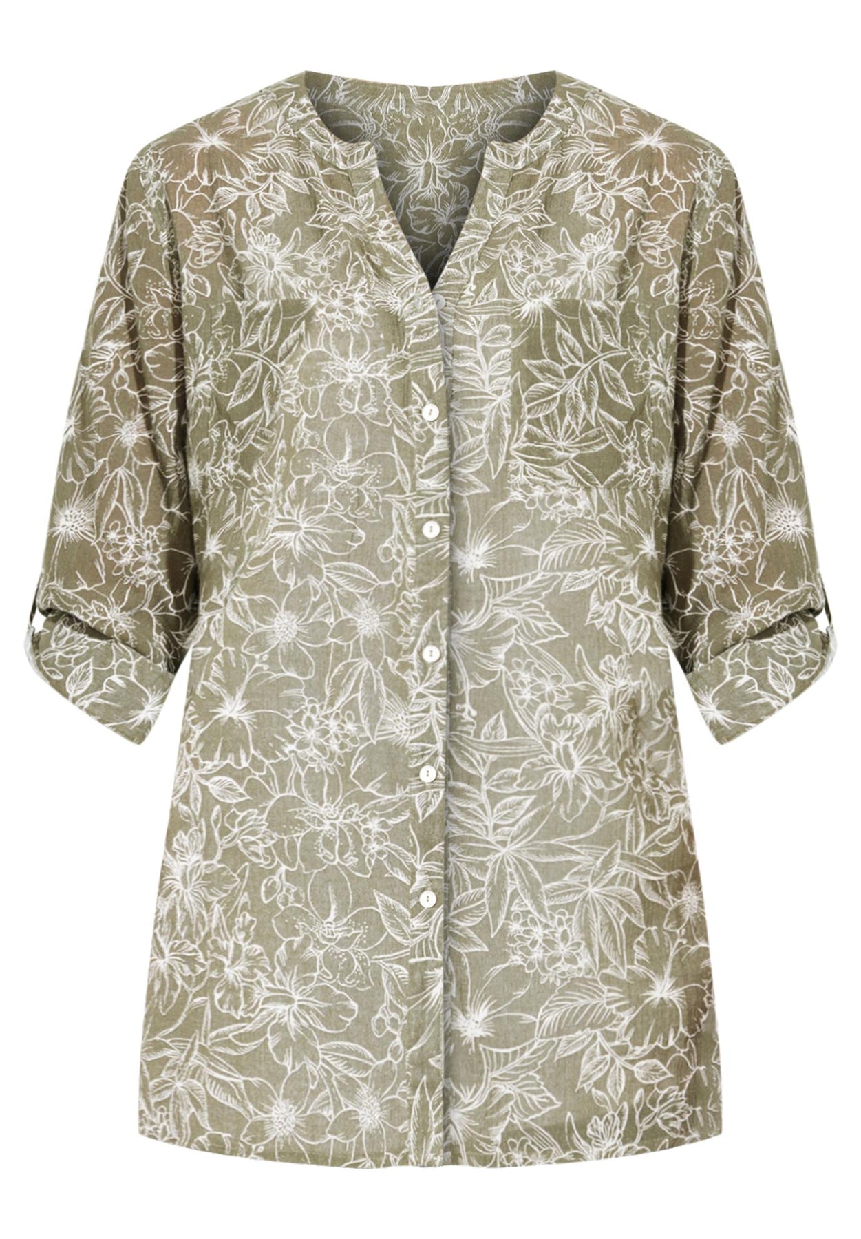 FIT: Relaxed and feminine silhouette. Mandarin collar. Y-neck buttonfront placket. Chest pocket. Bust darts for shaping. 3/4 sleeves with button-tab cuffs. High-low hem with curved side slits.