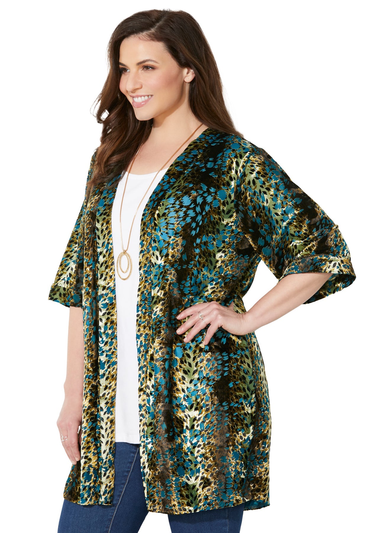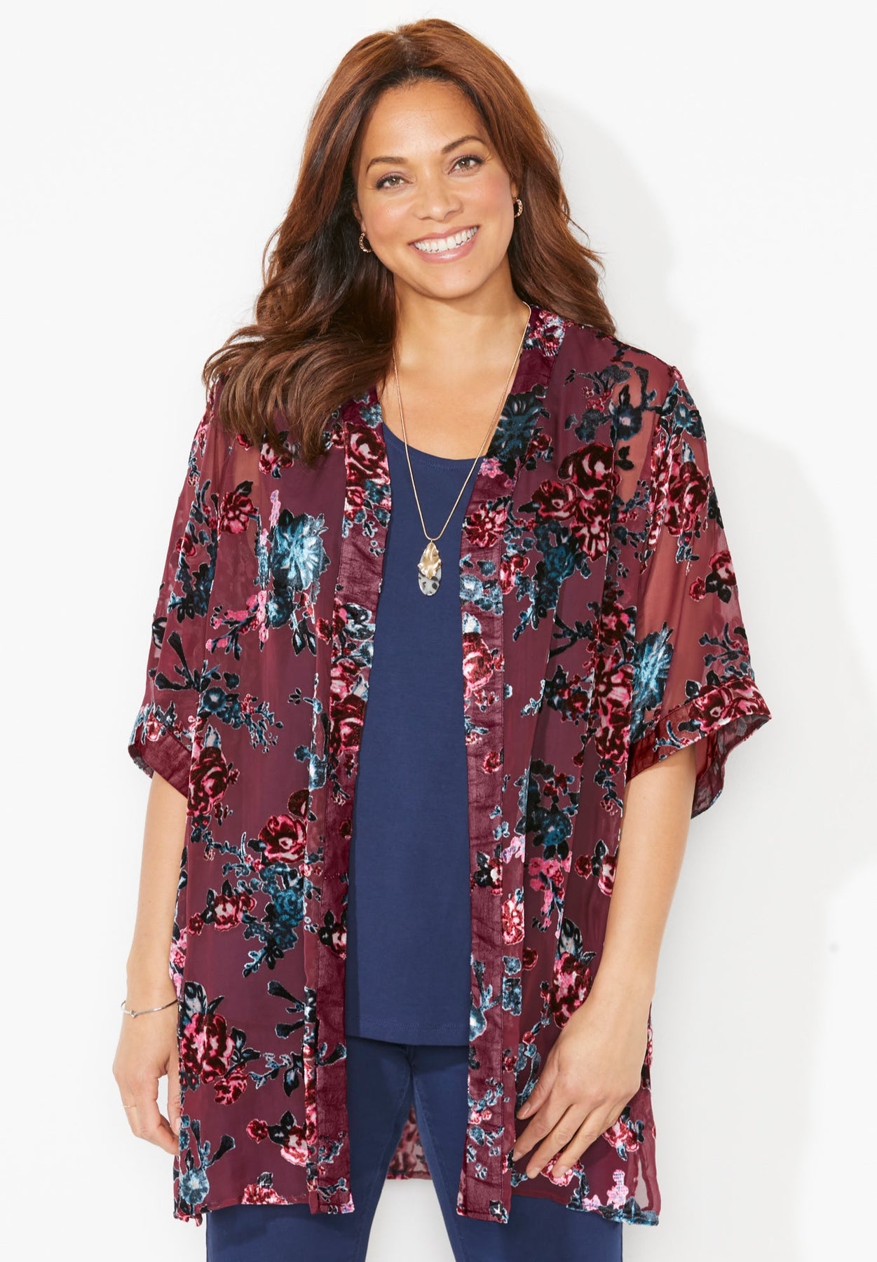 FIT: Lightweight, relaxed and refined. Floats over your curves and finishes every outfit beautifully. Open front. Wide 3/4 kimono sleeves.
