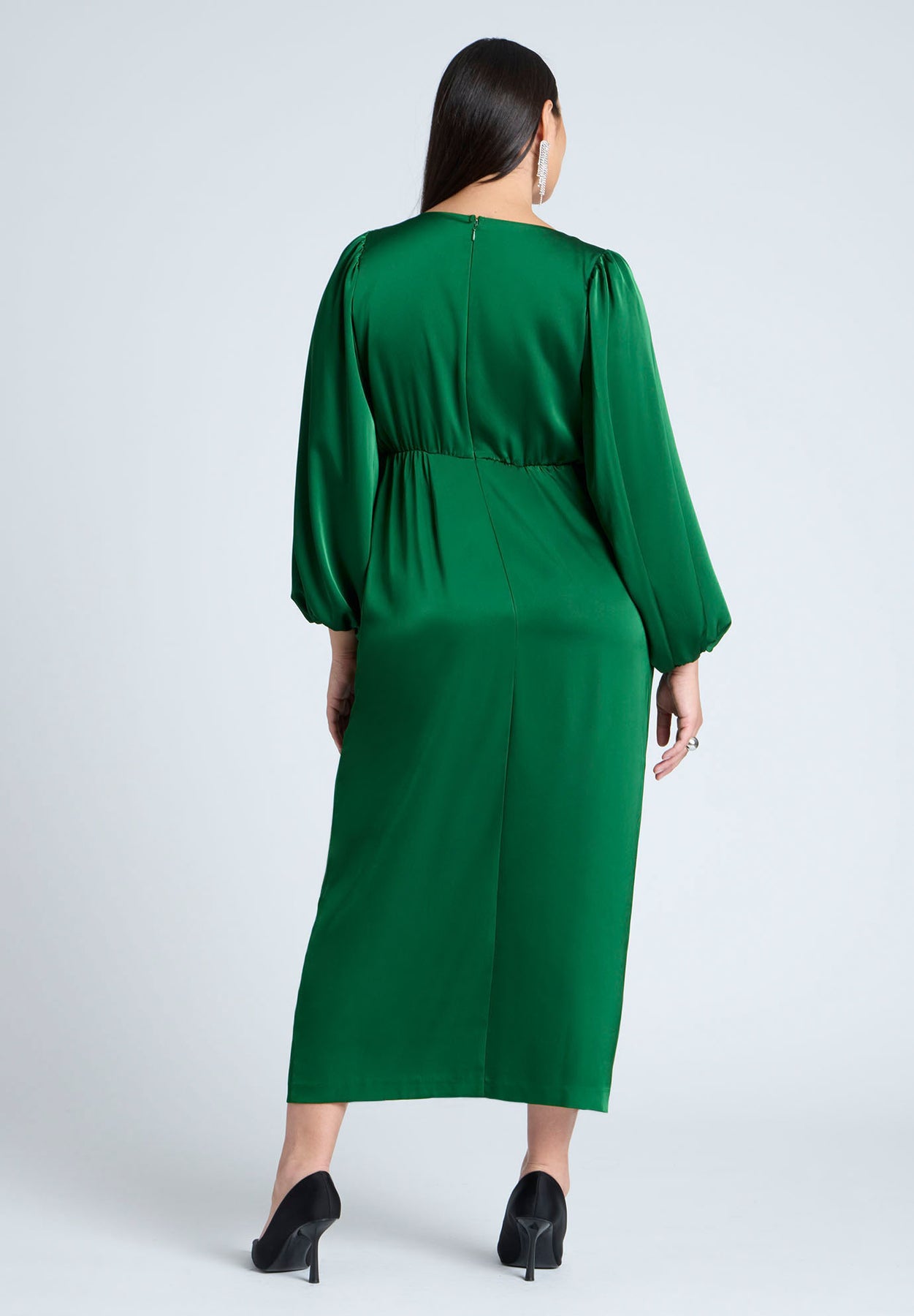 A head-turner in all its sleek, shiny glory—this non-stretch woven satin dress features dramatic puff sleeves, subtle draping, and a front leg slit that brings bold energy to any formal moment.