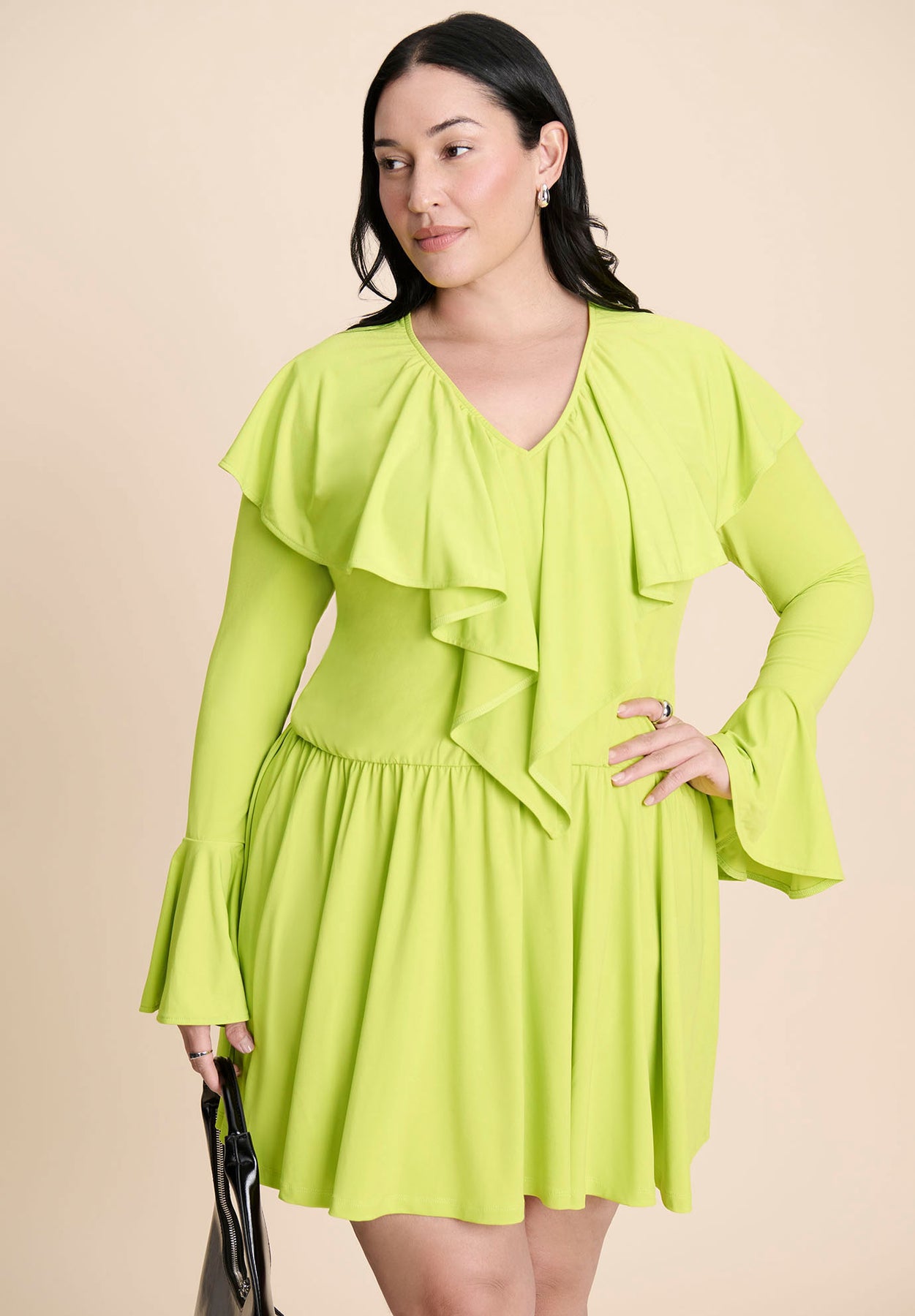 Bring playful romance to your LBD lineup with this flounced mini dress designed to move. A ruffled collar, dropped waist, and soft knit fabric make it a forever favorite.